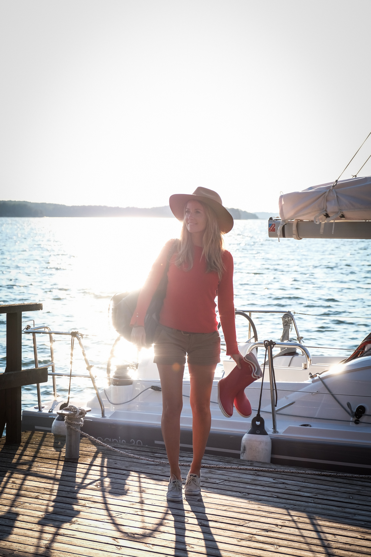 Pas de bain de foule à l’horizon seulement nous (une super team), les pieds dans l’eau depuis le ponton de notre maison. Mais avant de complètement s’installer, on se dirige vers la Marina. Pleine de Charme avec ses cabines en bois rouge et sa balançoire, l’esprit nordique est bien présent. C’est aussi le moment où l’on découvre le voilier : l’Océanis 30.1.