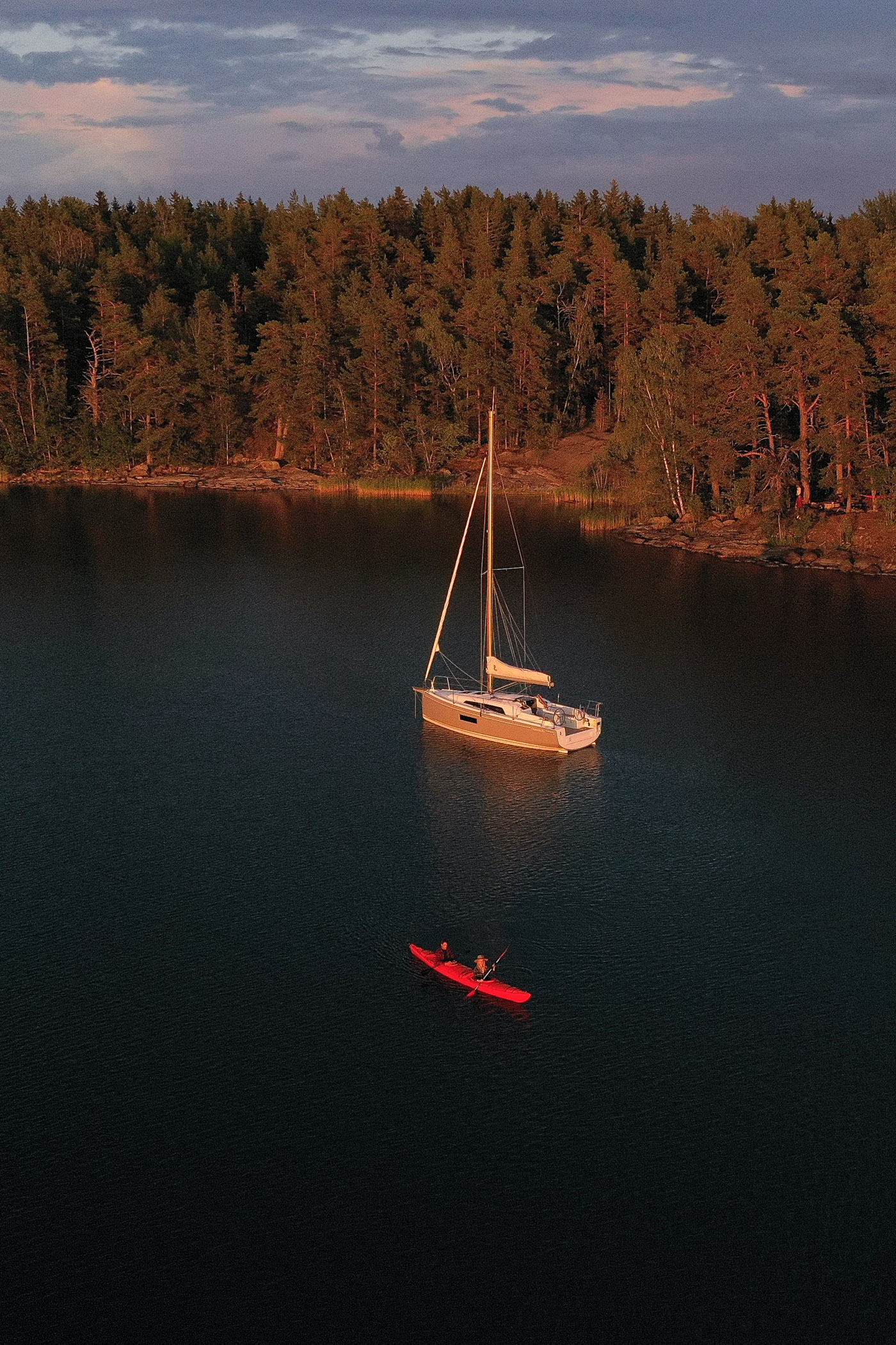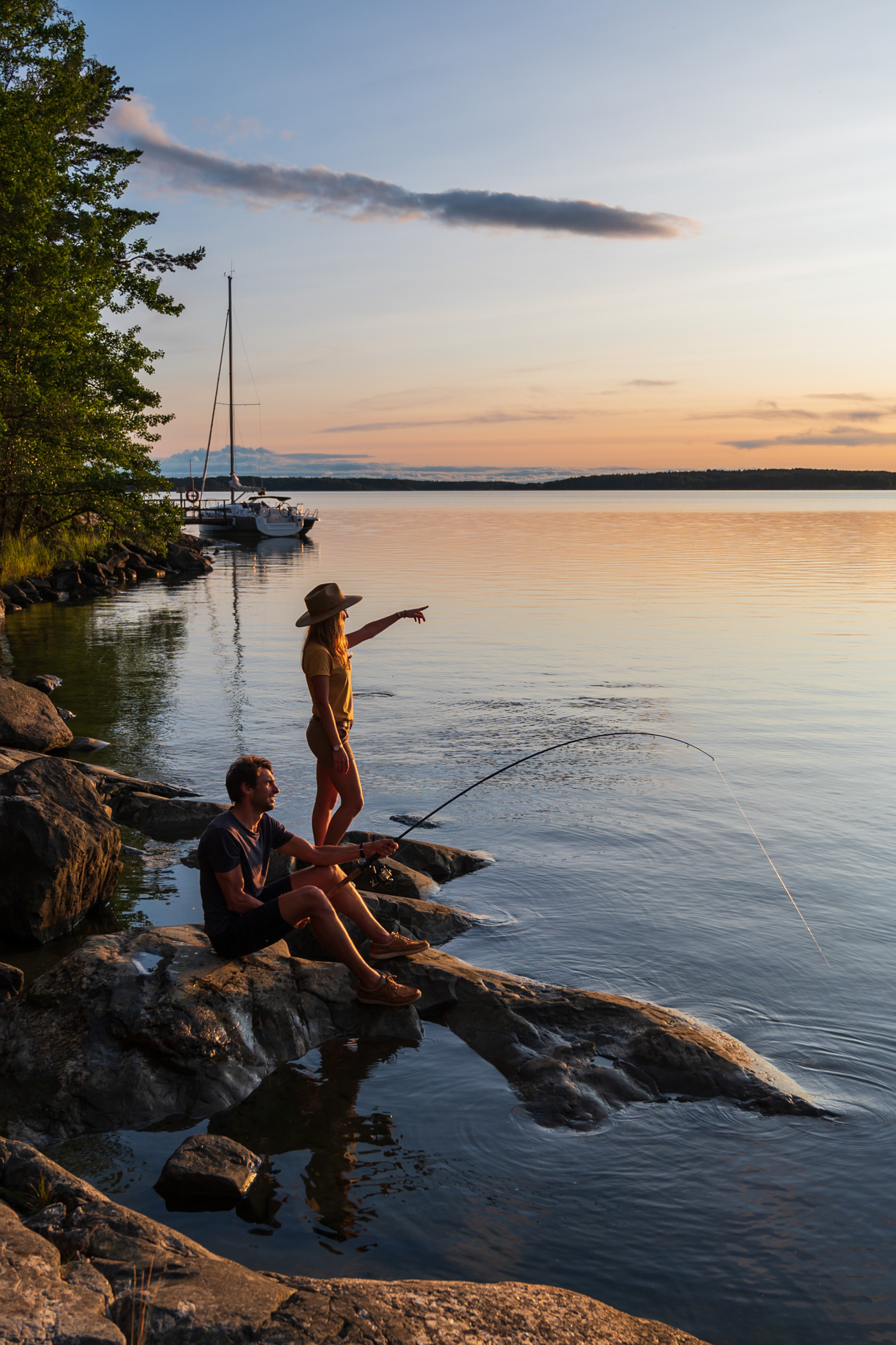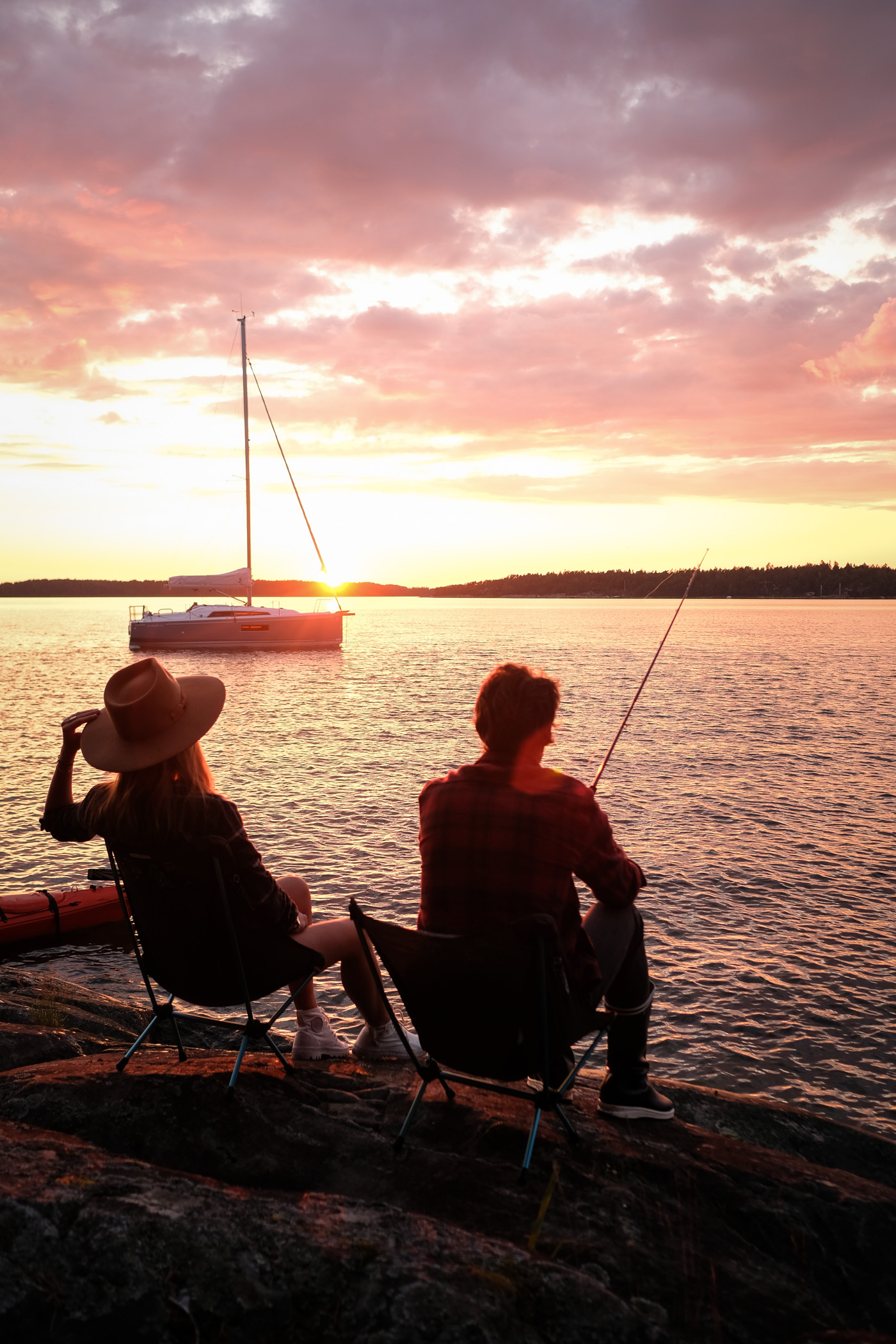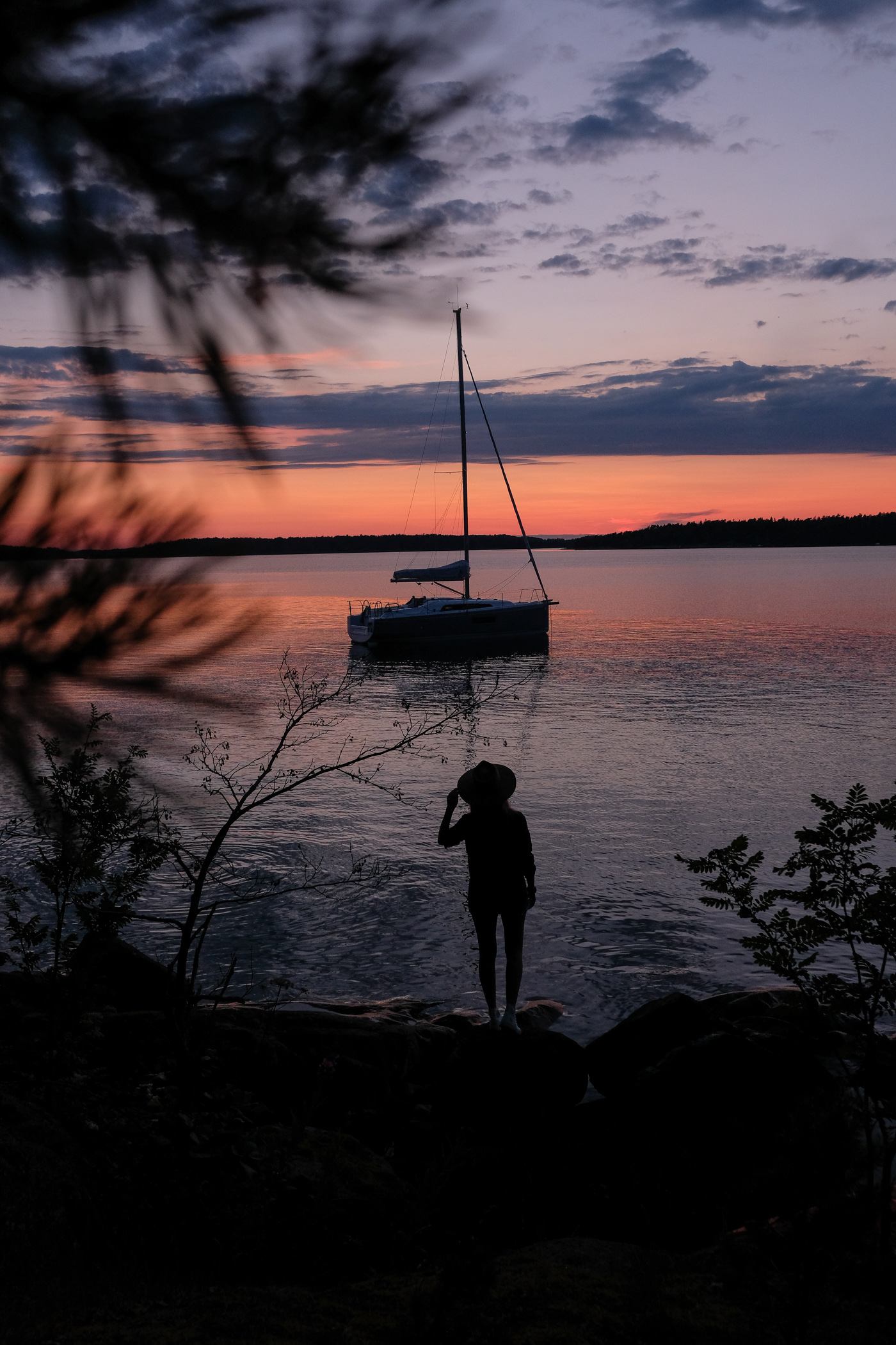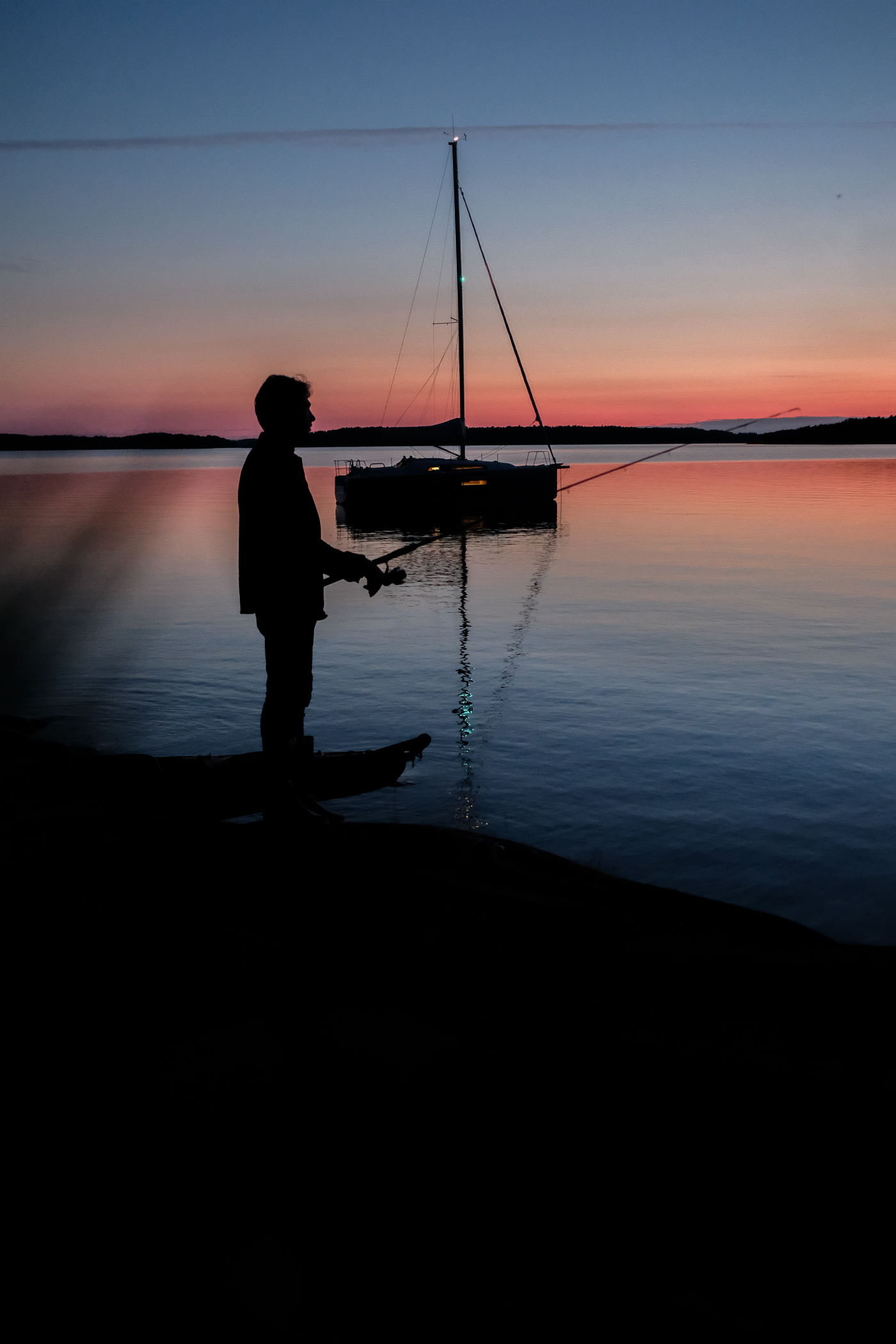 Et puis chaque soir c’est le grand spectacle. La lumière est extraordinaire ! En effet, à cette période de l’année, la Finlande ne s’endort jamais. La nuit tarde pour laisser place à une placette de dégradés jaunes, roses/orangés. Et oui, le coucher de soleil règnent pendant des heures avant de tirer sa révérence. Alors quand on décide faire un barbecue face à la mer avec en fond le voilier, ça donne ces souvenirs idylliques !