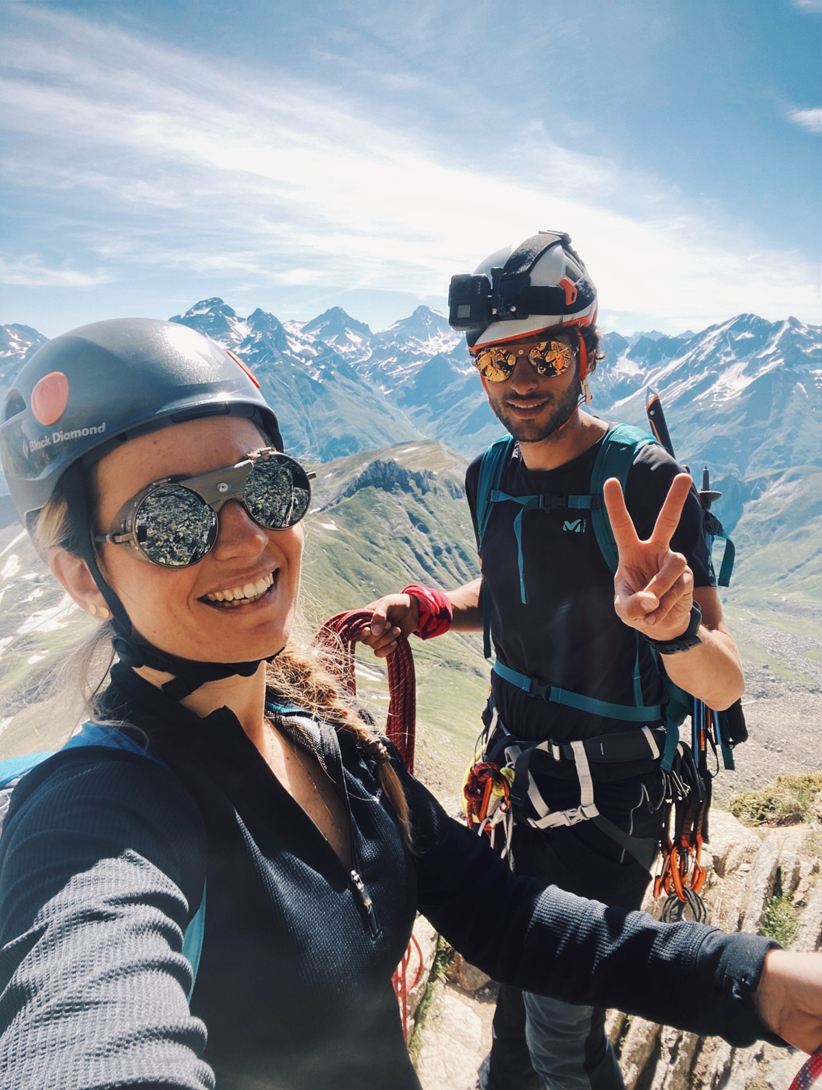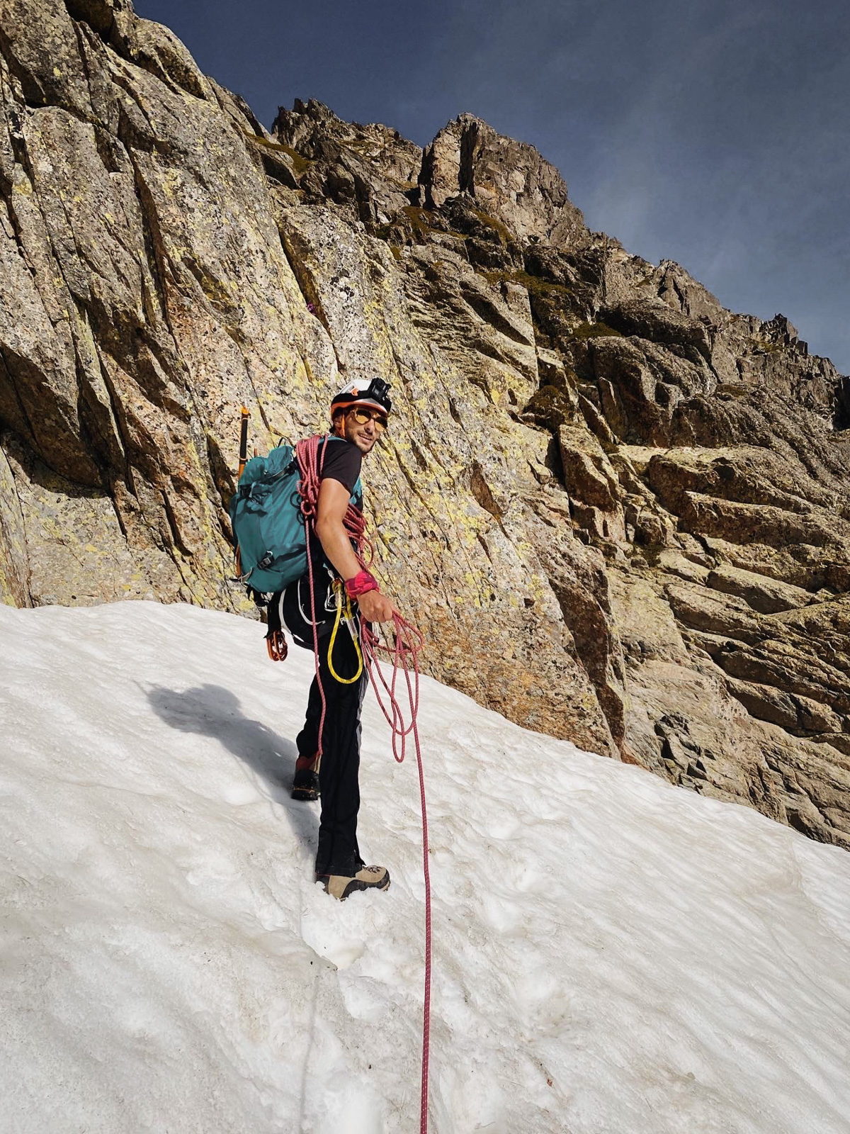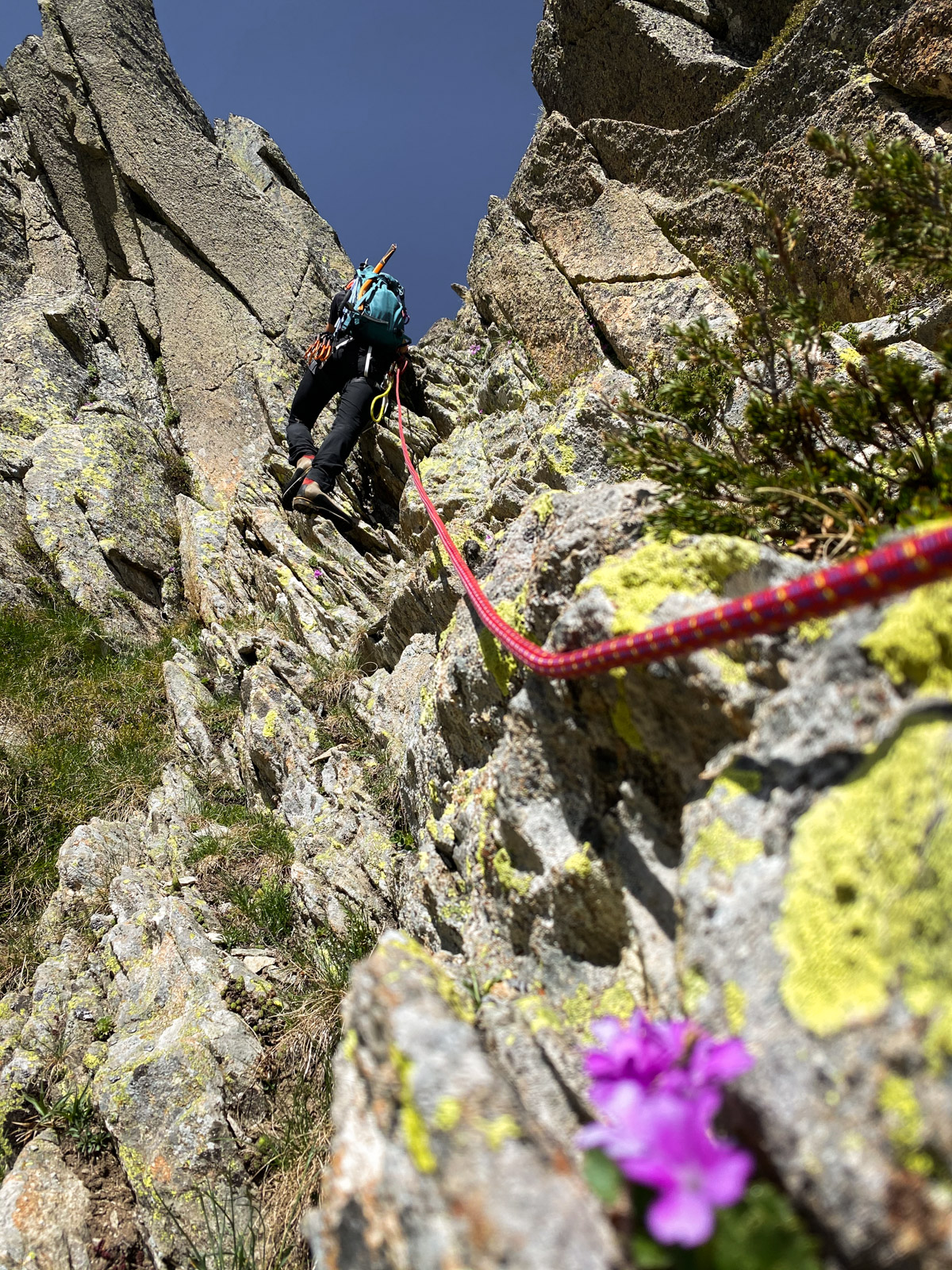 Équipés de nos casques, baudriers, assureurs, mousquetons et corde, (crampons et piolet : il y a encore de la neige avec passage dans les nevets. ), je commence à sentir que l’ascension est un peu engagée. Au pied de la première cheminée, les choses sérieuses commencent et notamment après plusieurs changement d’itinéraire pour grimper les premières cheminées. Même si peu familiarisée avec la descente en rappel et l’escalade tout se passe plutôt bien dans ma tête. Il faut dire que Camille est expérimenté en escalade avec une bonne connaissance du terrain. Finalement, il ne tenait qu’à moi de continuer et j’ai eu peur en haut de cette seconde cheminée. Je vous laisse imaginer Camille me regardait et tirer la corde pour que je continue de grimper. Tout est toujours une question de perspective : 1 pas pour lui sur une prise en représente 1 et demi pour moi !