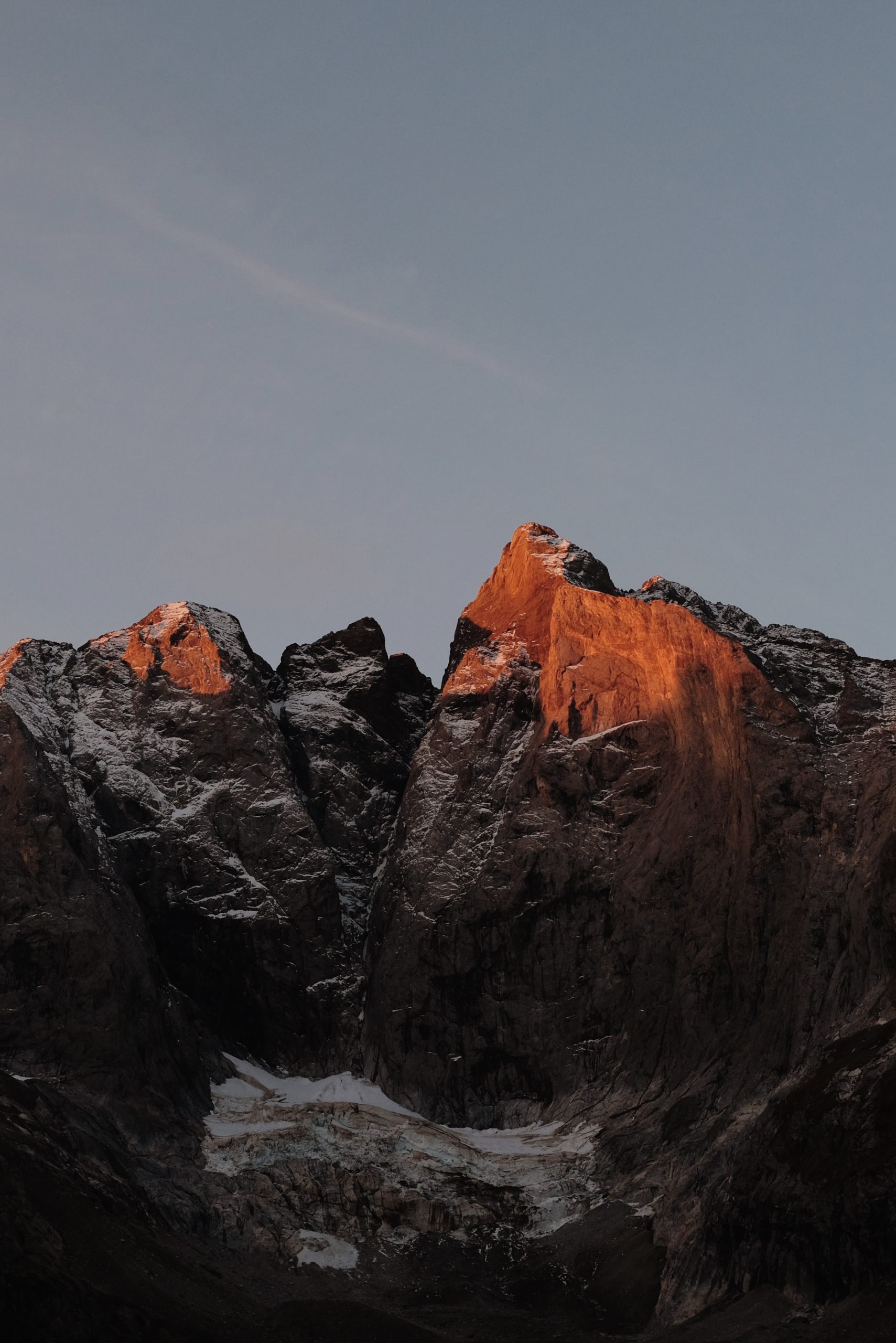 Si majestueux avec son glacier, lumière au point aux couleurs roses orangées sur son sommet, où pendant ce moment silencieux, tu t’imagines secrètement déjà arrivée tout en haut.