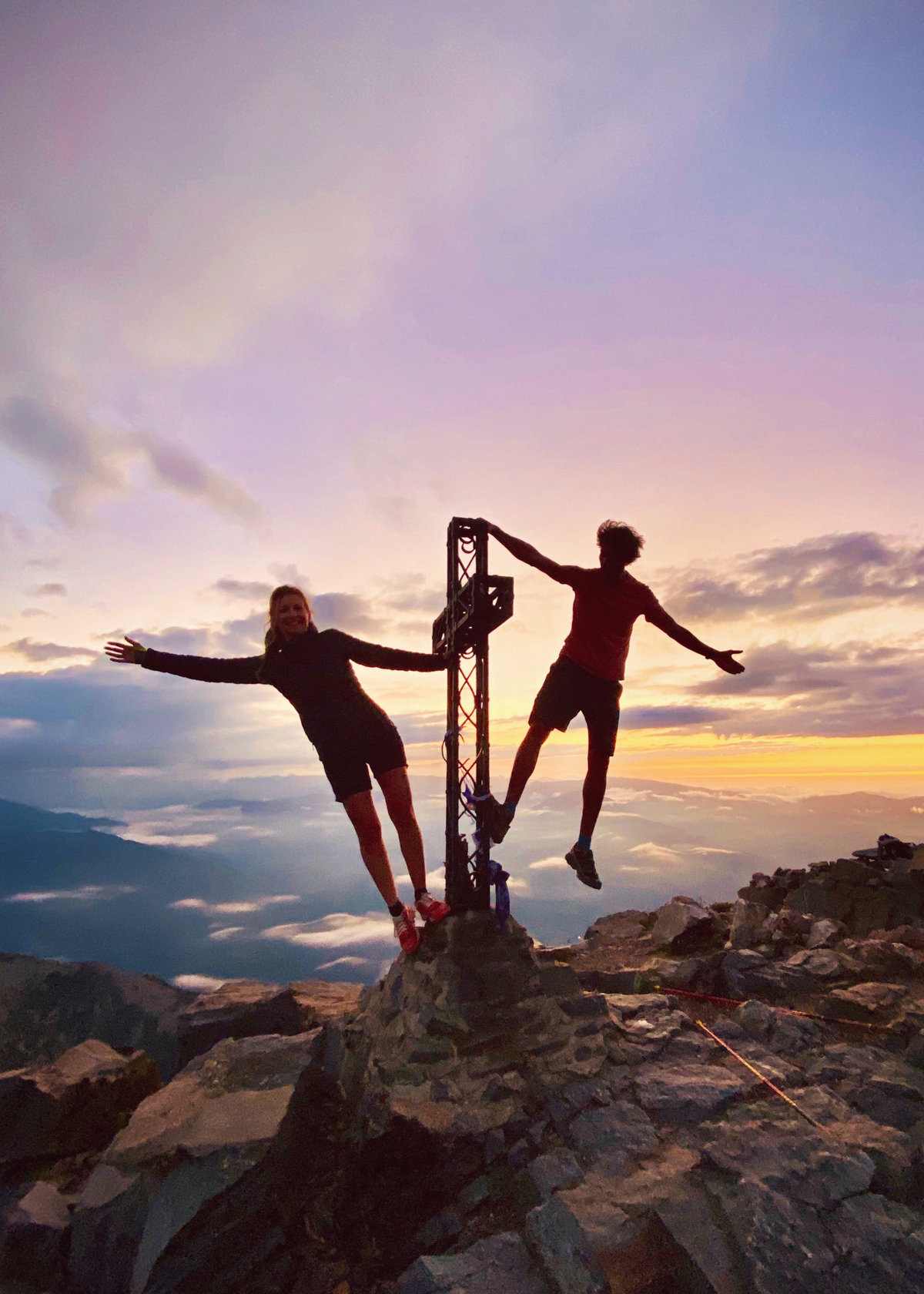 Et arrivés au sommet, la satisfaction est TRES grande. Après 5h30 d’effort, j’étais soulagée de pouvoir, ENFIN, souffler et avaler une bonne collation au sommet. Mais avant ça, on s’est suspendu à La Croix (symbole du sommet) comme des enfants. C’est d’ailleurs, nos voisins de bivouac qui ont immortalisé ce souvenir.