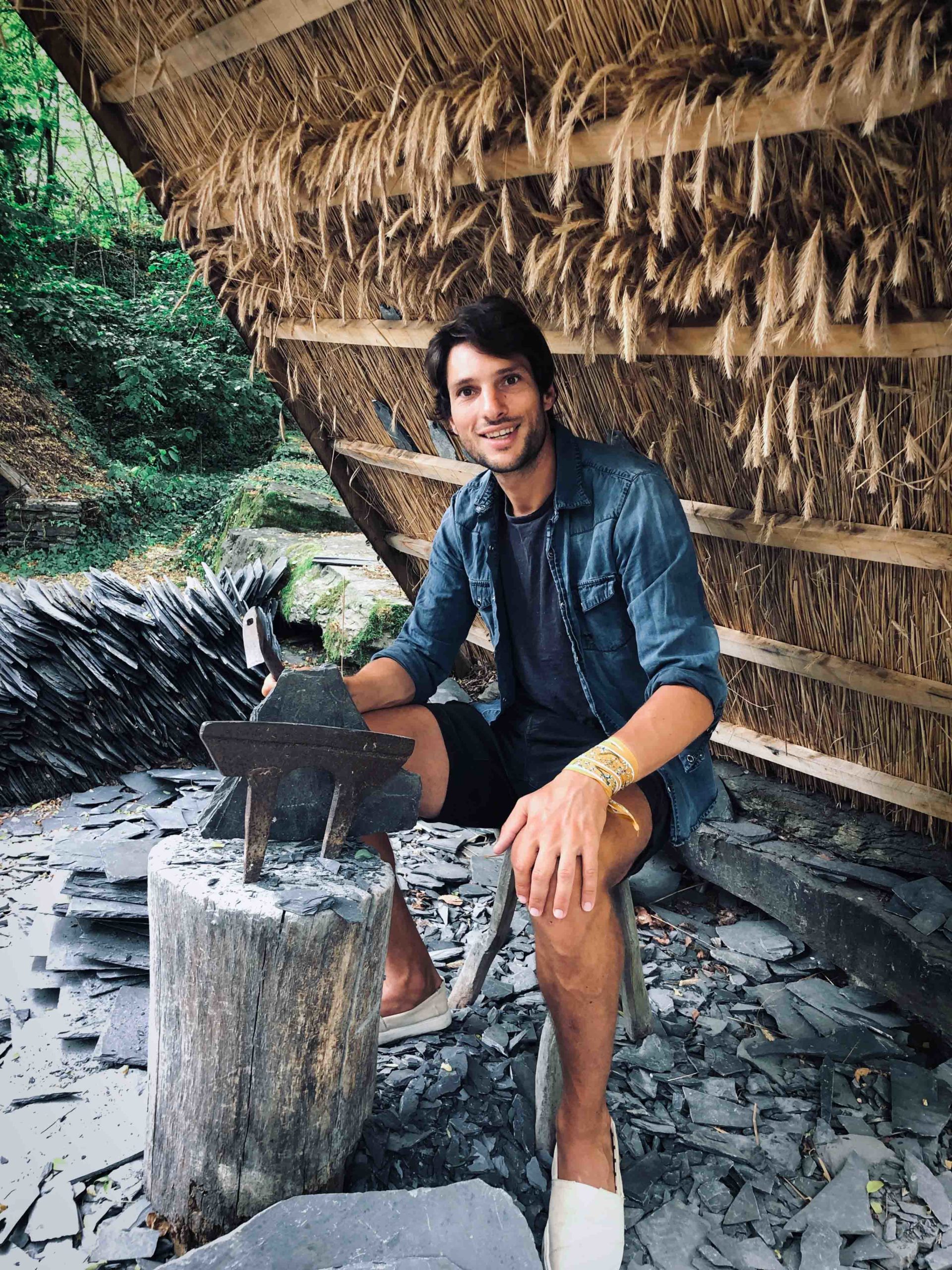 Ce qui m’a le plus frappé ce sont ces falaises abruptes et verdoyantes. On se serait cru tout droit sorti d’un film de Jumanji ! En plus, on a pu tester le travail de découpe ancestrale d’une ardoise que nous avons ramené en souvenir. Je crois bien que Camille a pris plaisir à s’initier au métier d’ardoisier. On a eu du mal à le déloger.