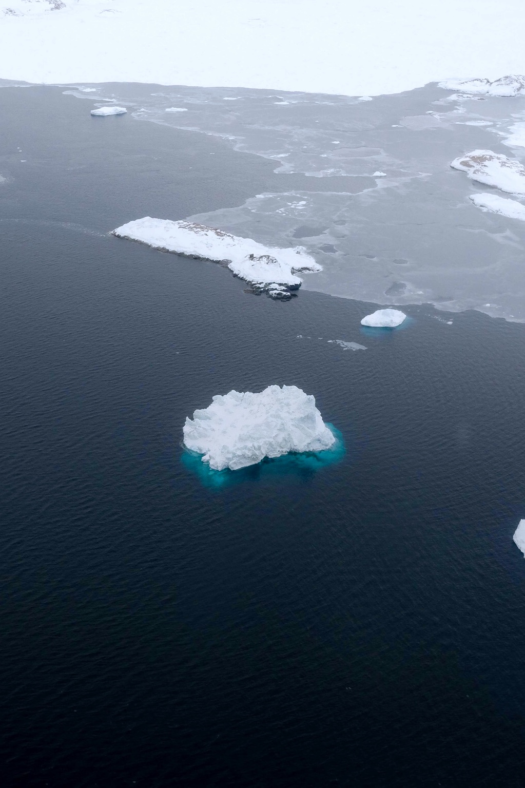 J’assiste avec Camille à l’un des plus beaux moments depuis le départ de cette expédition. On n’en perd pas une miette. Et Pascal, non plus. Le temps est plutôt couvert mais on distingue si bien la banquise, les icebergs et le relief de ses montagnes.