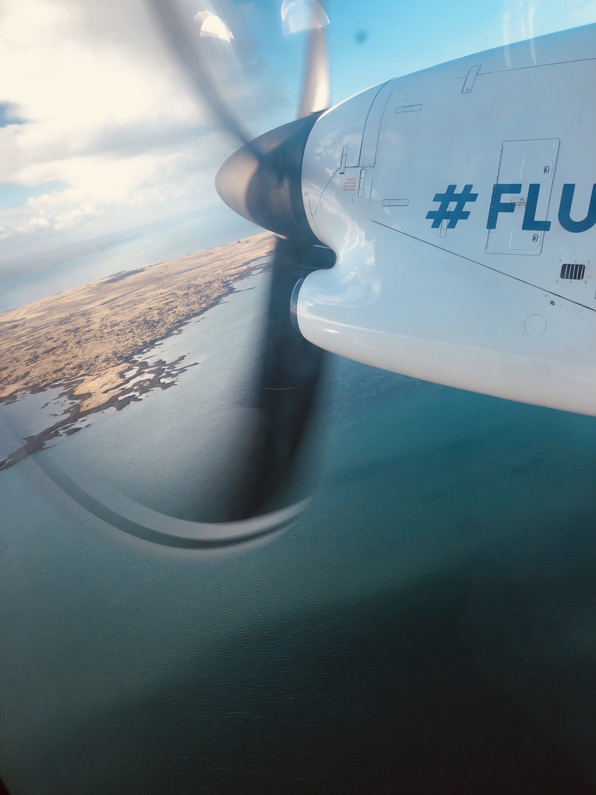 L’heure du départ approche, on contourne la piste puis arrivés sur le tarmac, j’aperçois un petit avion. Le plus petit avion que j’aie jamais pris (je ne compte pas l’hydravion). Forcément je suis surprise de voir les hélices tourner depuis le hublot.