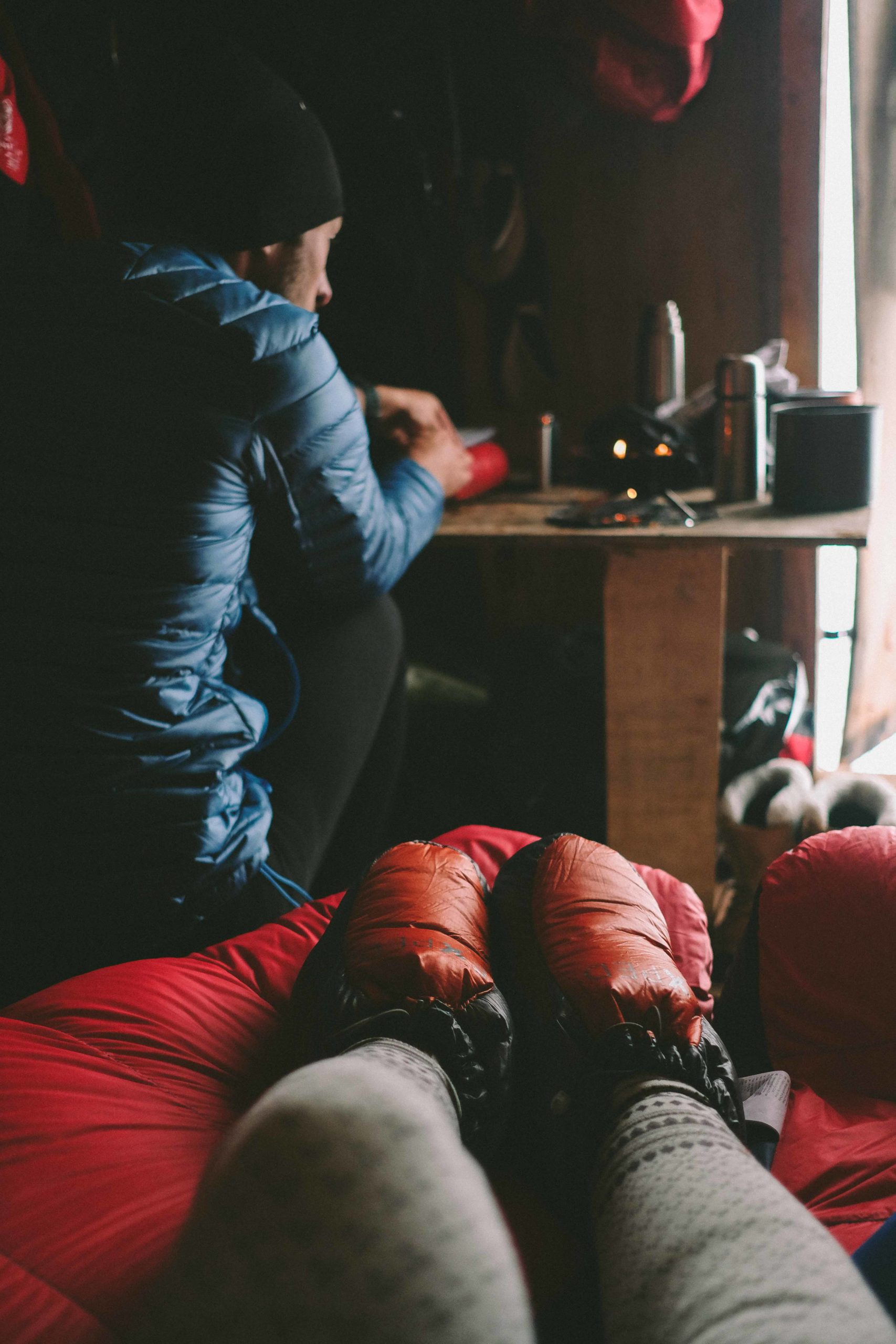 Ouverte, on décide de s’y installer. L’installation est sommaire, une planche de bois et quelques clous pour étendre nos effets, C’est une entrée en douceur pour notre première nuit en bivouac hivernal. Le luxe ! Quand je me refais le film de la journée à lutter contre la neige et la pluie. Cette nuit de répit on l’a savourée.
