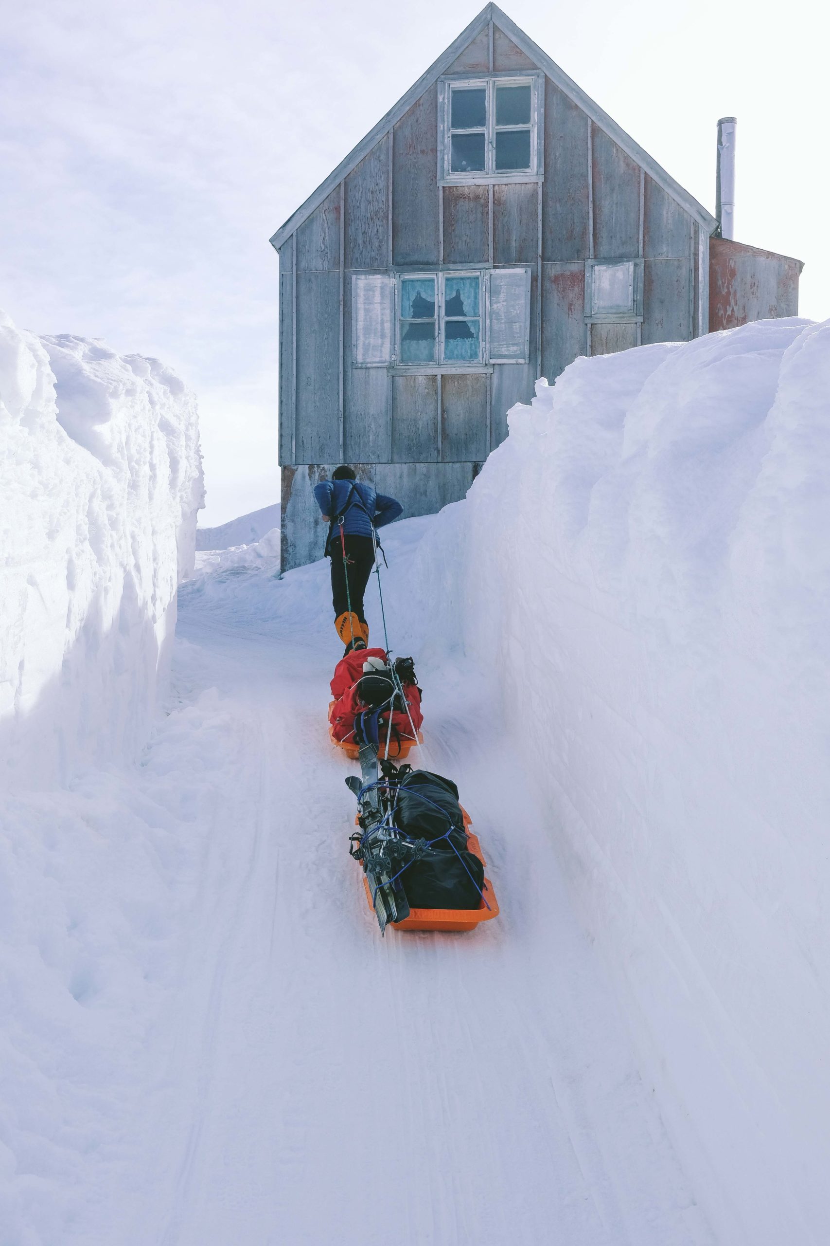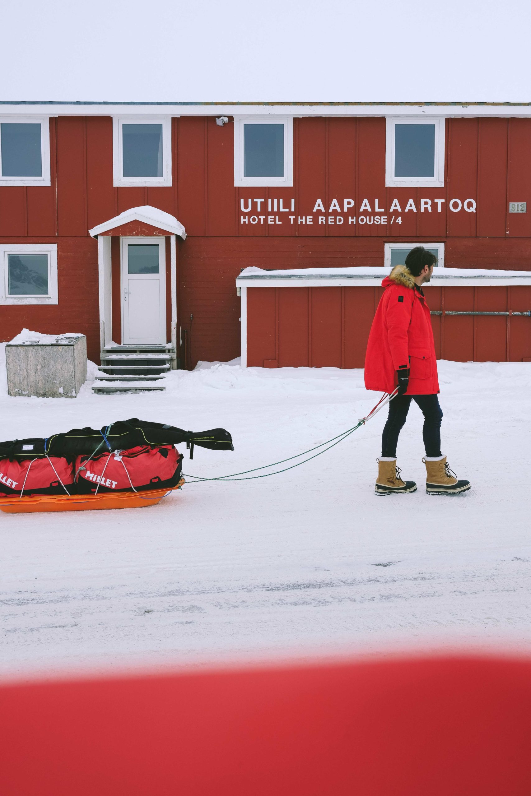 Tasiilaq, on traine nos pulkas dans la neige pour regagner la Red House. Notre point de départ avant de démarrer l’expédition. On ouvre la porte du refuge et c’est ROBERT PERONI en personne qui nous accueille. Un explorateur tombé amoureux de cette île il y a déjà quelques années et auteur de nombreux ouvrages sur le Groenland. Il nous fait le tour du propriétaire. On découvre alors un grand chalet, similaire à nos refuges mais en beaucoup plus confortable.