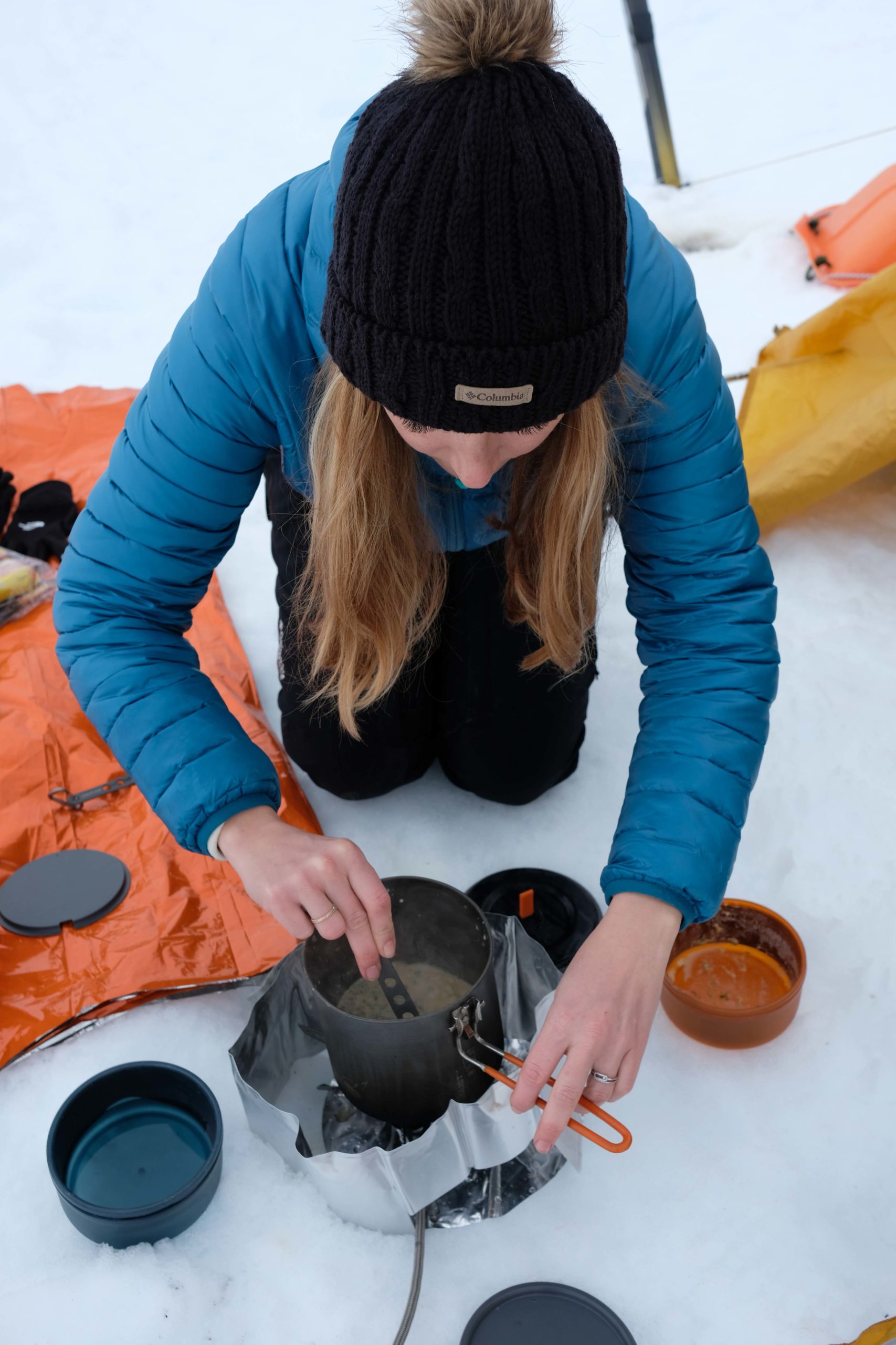 Il reste un peu plus de 22 km et nous n’avons aucune visibilité avec toute cette poudreuse. On prépare nos pulkas. Camille récupère de l’eau à la rivière et j’installe les peaux de phoques sur nos skis.
