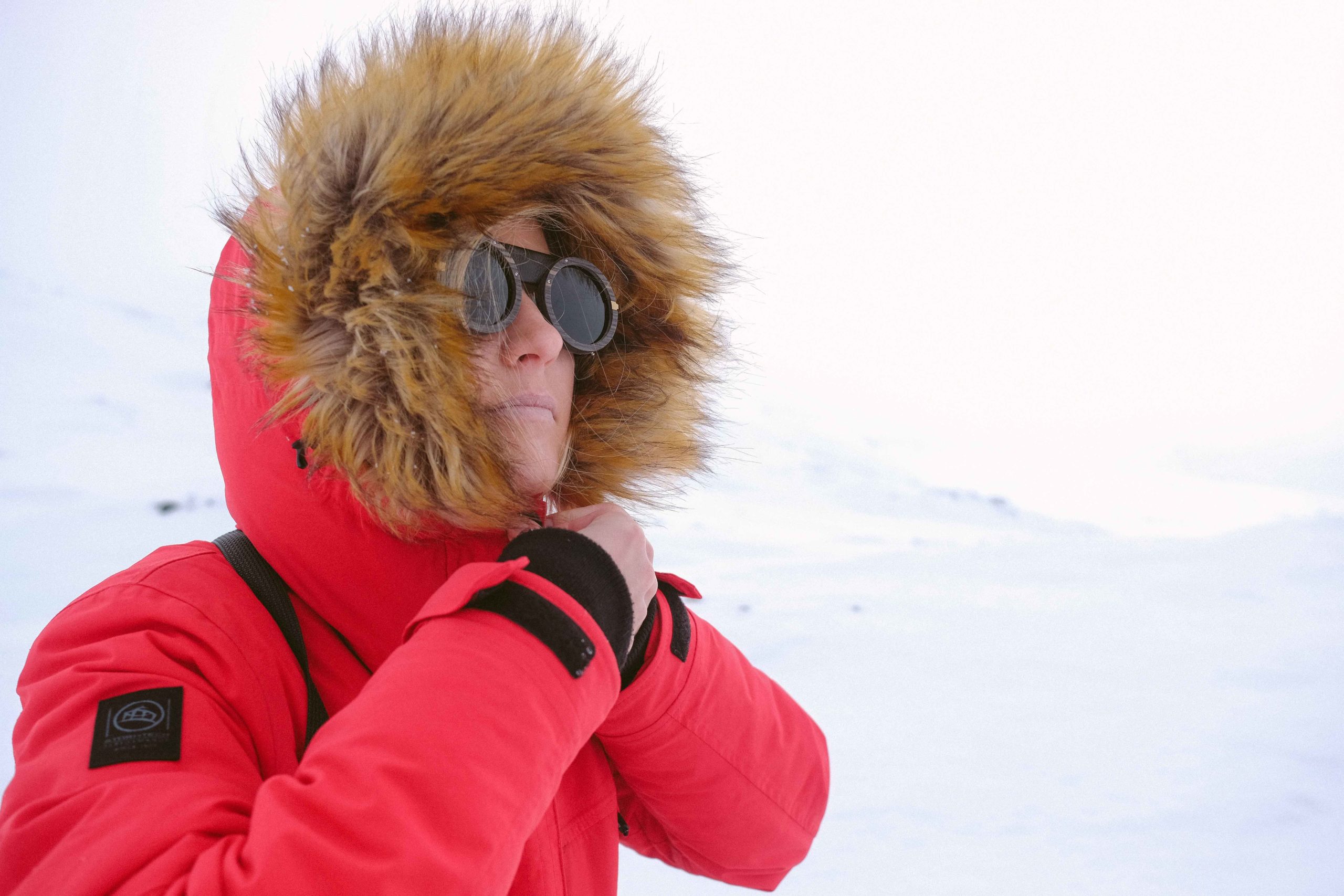 Comme le sentiment d’être au bout de la planète, ciel bas on avance sur ce dôme durant deux heures sans avoir de perspective. Je peux vous assurer que ça fait un drôle d’effet. Le glacier est vraiment très grand. Alors dans la descente, on se jette en Pulka dans le vide.. Qui dit première fois en ski nordique dit quelques chutes. Plus à l’aise en côte, les descentes sont une vraie partie de rigolade. Camille ne semble pas stable non plus même s’il se débrouille bien mieux. La vitesse de glisse de nos pulkas respectives nous déstabilise. Un coup en avant un coup derrière pour finir par nous taper dans les chaussures. On s’est fait surprendre plusieurs fois alors c’est en luge que nous sommes descendus.