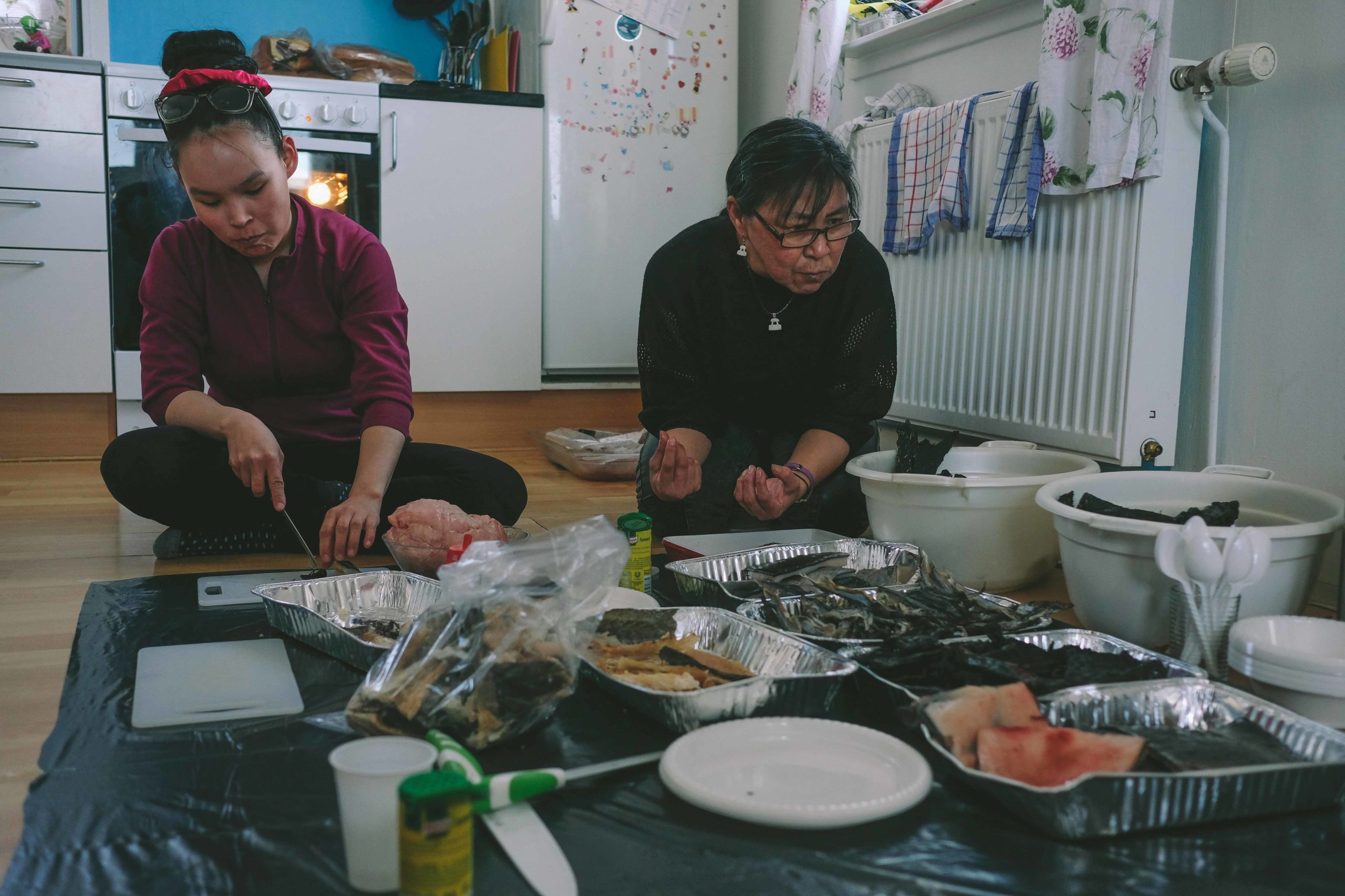Je ne pouvais clore ce passage sans faire référence à leur petite touche locale, celle de la dégustation de poissons crus, baleines et phoques. Installées sur une bâche en plastique noir, ces femmes découpent en sashimis ces gros poissons. Camille s’y colle. Il ne semble pas emballé mais l’assemblée lui sourit et le remercie d’avoir gouté.