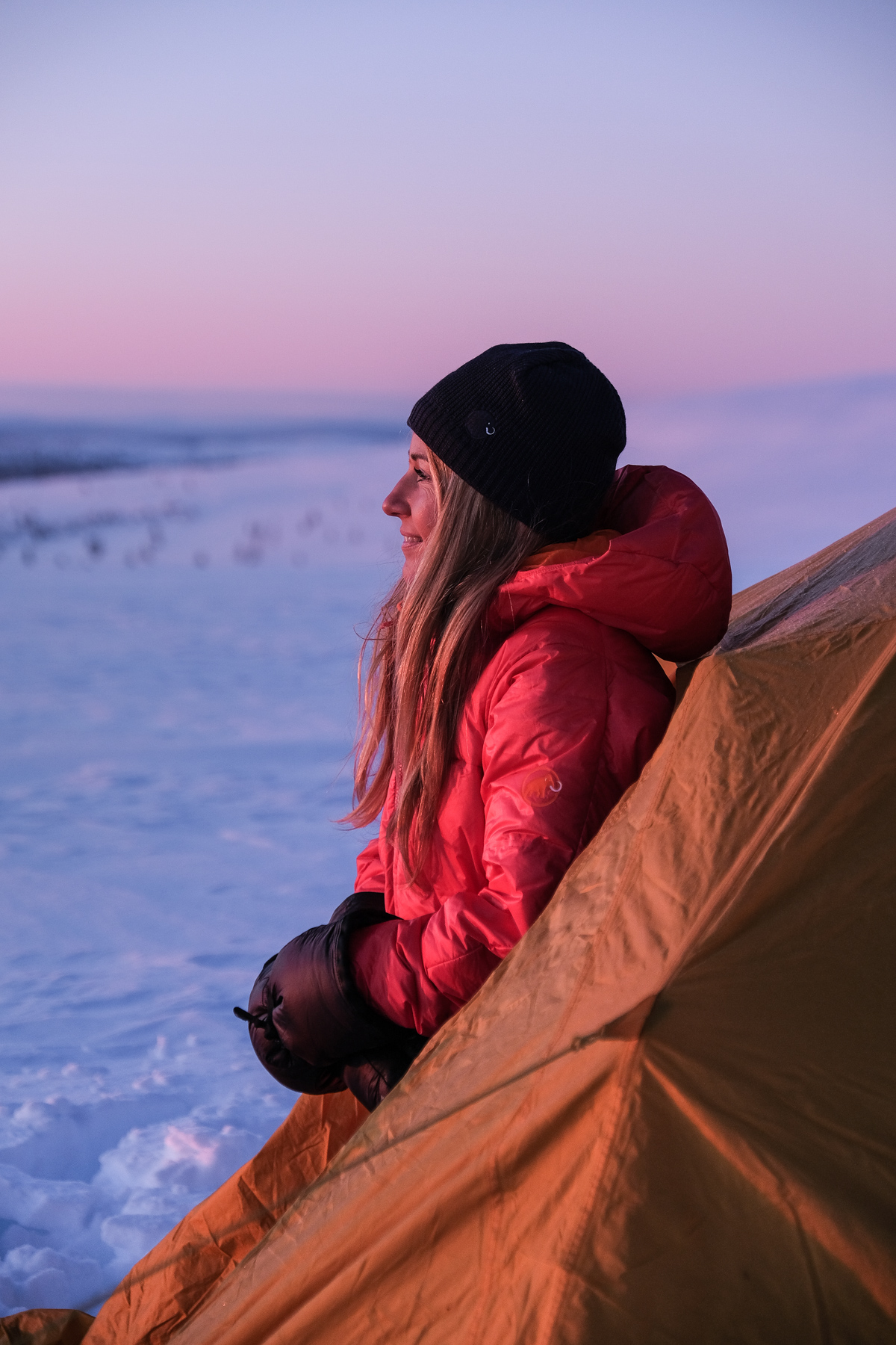 J’observe Camille s’amuser dans la poudreuse comme si c’était la première fois qu’il découvrait la neige. Comme un enfant il se laisse tomber, il se laisse aller dans ses propres rêves. Et pendant ce temps les températures grimpent comme jamais dans notre tente. On frôle les 20°C ! Oups, on s’est une nouvelle fois un peu trop emballée jusqu’à en faire brûler un petit bout de notre tente. Il faut toujours être prudent en manipulant le réchaud à essence. Si bien que quelques gouttes se sont échappée tombé sur le tapis de sol extérieur. En tapant avec ses gants, les mains de Camille on pris feu, rien de mal, rien de grave mais on s’est fait peur.