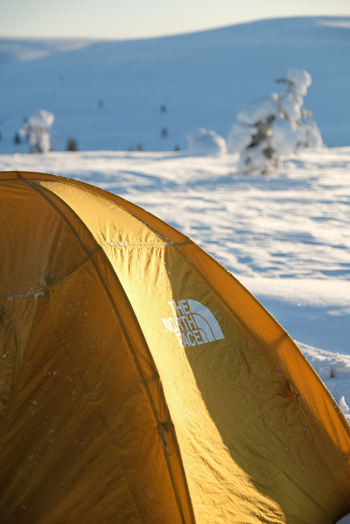 Après une excellente nuit de sommeil, on admire le lever de soleil entre les branches des sapins enneigés. Le poids de la neige semble lourd pour ces grandes silhouettes cotonneuses. On a envie de rester encore de longues heures à les contempler. Alors on prend le temps de prendre un petit déjeuner, à base de granola au chocolat avant de lever le campement.
