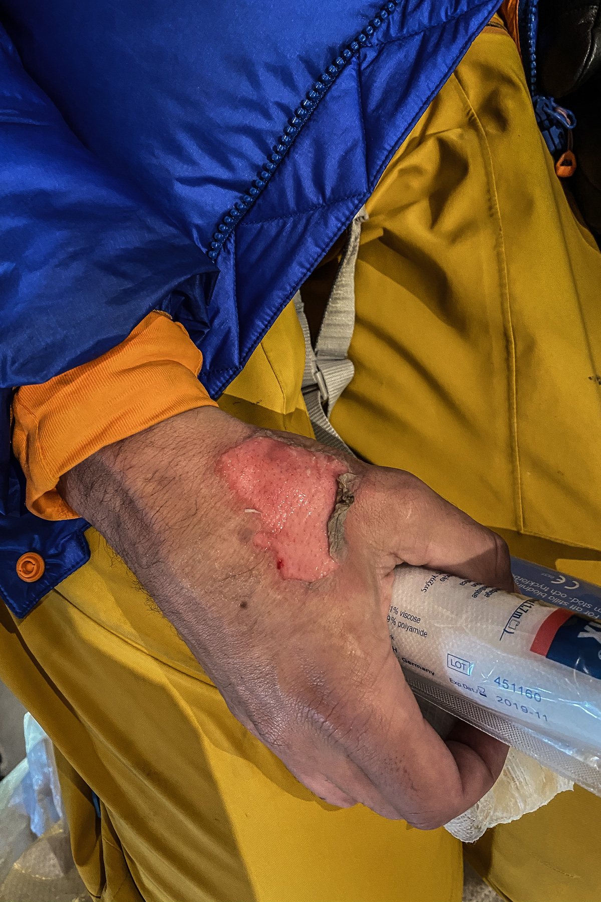 Brulé au second degré, il fait mine de rien et les -15° degrés dehors semble anesthésier sa douleur. On attrape alors rapidement la trousse de secours pour réaliser les premiers soins.