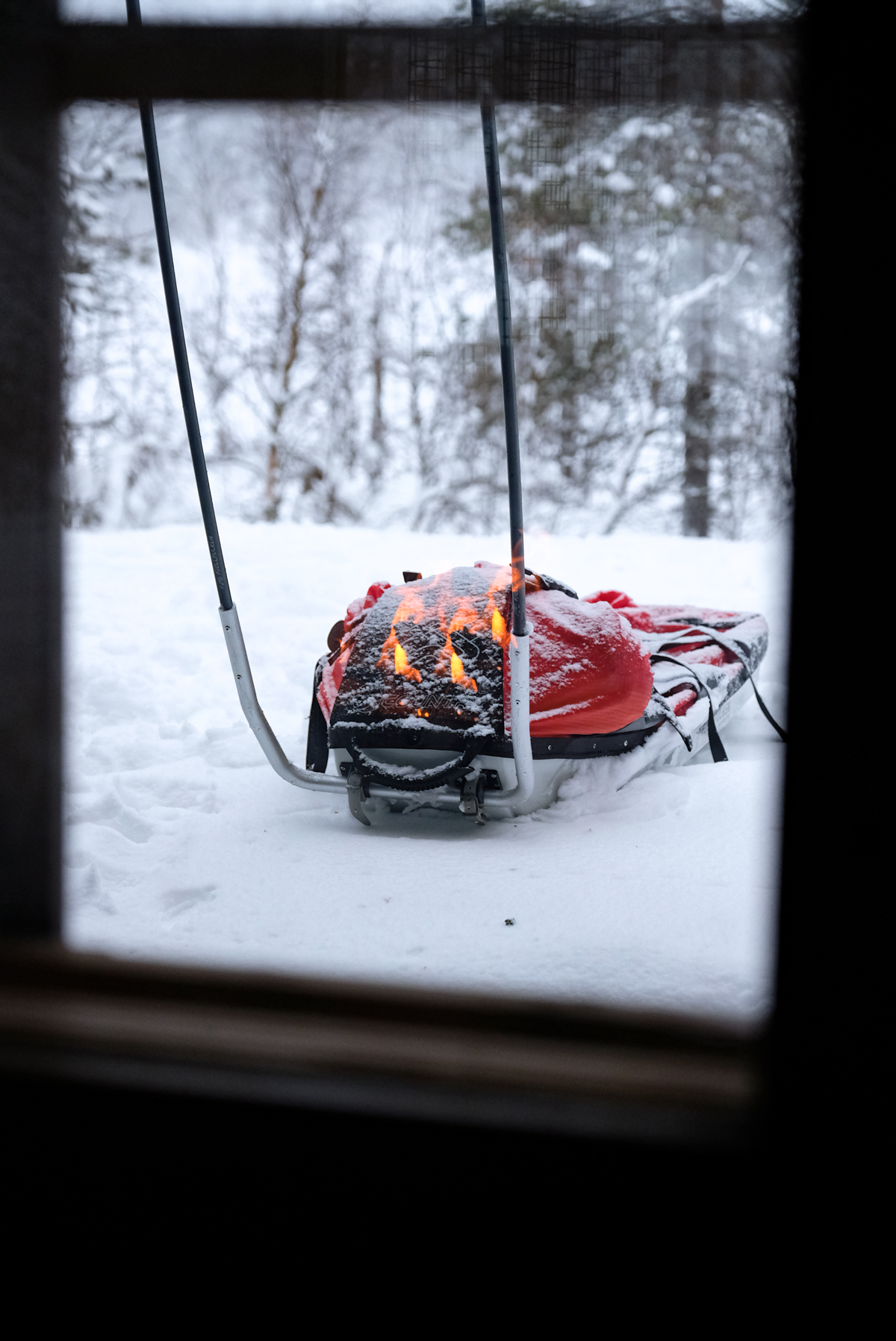 La Laponie Suèdoise doit être tout aussi charmante- Je ne pourrais pas comparais les deux pays, mais j’imagine que les paysages arctiques restent aussi beau des deux cotés. Pour la préparation je dirais un mois. Physiquement on est toujours un peu actif mais c’est vrai que l’aventure était compromise avec la facture de la clavicule de Camille (La 4eme au même endroit). Au niveau de l’équipement, on a repris en grande partie le matériel du le Groenland mais cette fois-ci on a acheté une pulka. Camille lui a confectionné un sur-sac (le rouge) pour protéger nos sacs à l’intérieur –