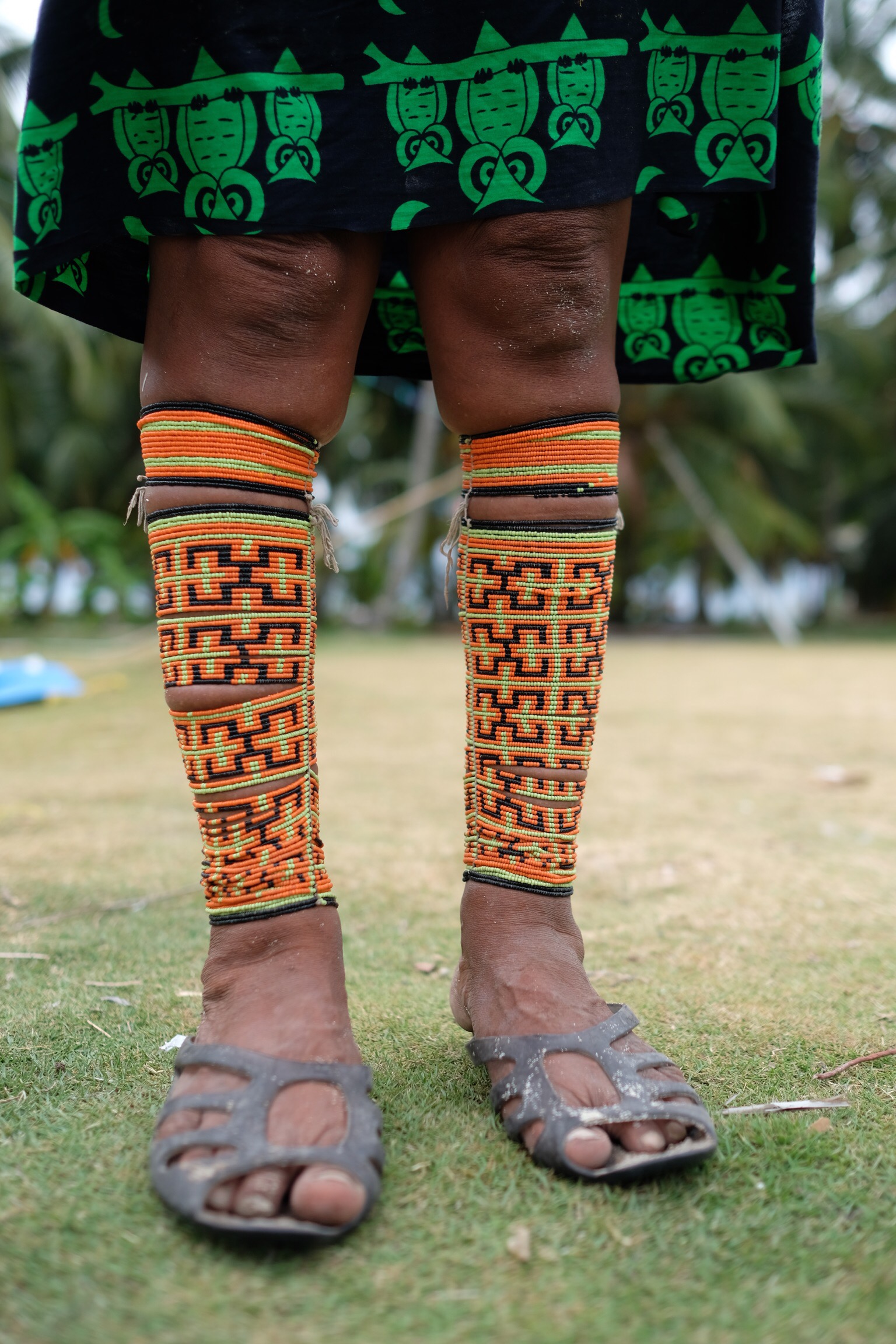 Les femmes portent tous les jours cette tenue traditionnelle aux couleurs vives. Ces tissus colorés et brodés par leurs soins sont appelés des « Molas ». Ces plastrons sont réalisés à partir d’un assemblage de plusieurs tissus cousus. Un vrai patchwork de dessins de couleurs qui leur vont à merveille. Quelques unes d’entre elles portent encore un anneau en or dans le nez, comme cette femme ci-dessous.