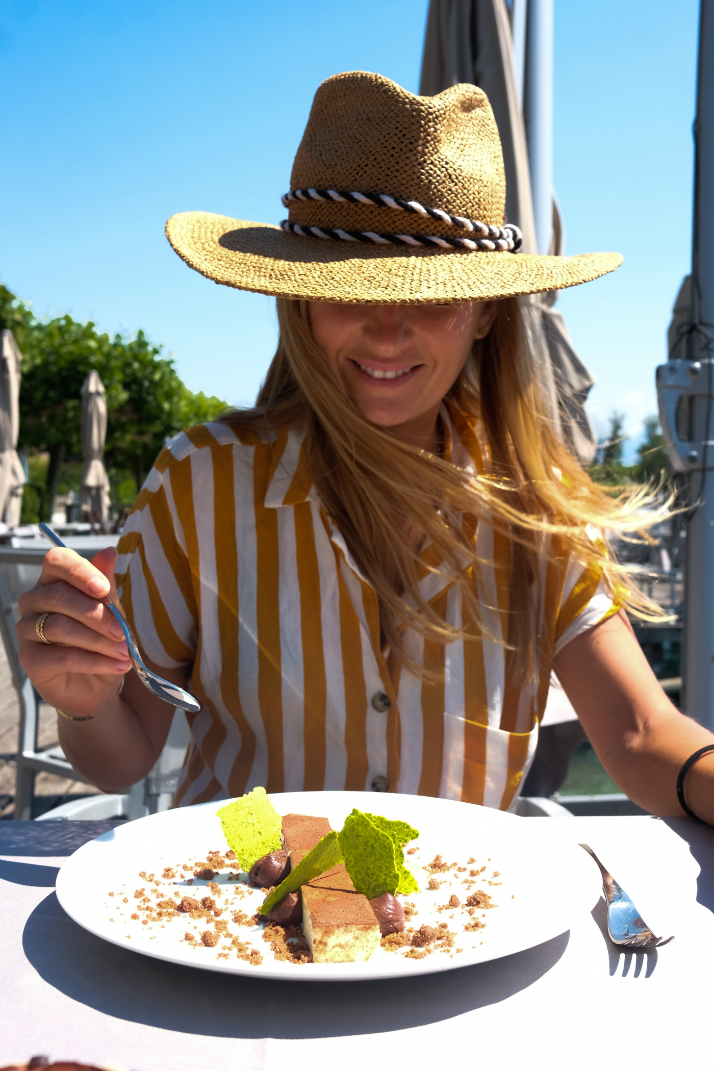 Pendant que Camille gare la voiture, je m’approche du restaurant. J’aperçois par transparence dans les portes vitrées, la couleur turquoise du lac. Nul doute, c’est déjà très beau. Je presse donc le pas de Camille pour s’installer à notre petite table. Il s’ensuit un panorama exceptionnel. Désormais, je ne sais plus vraiment où regarder la vue ou l’assiette.