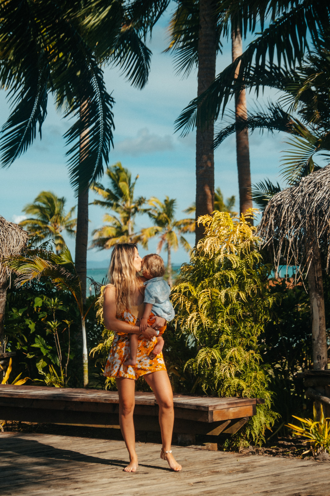 Pour nos petits, en gros on avait : 2 tenues de protection UV chacun, des barboteuses et des salopettes légères, shorts, T-shirts, chemisettes, gigoteuses légères. Sinon ils sont restés pas mal en couches ! A propos des couches, l’idéal si on a la place, c’est de venir avec son lait + couches + couches de bain (on en a vu très peu ici). On a bien testé un « grand » magasin à Apia, le prix des couches est correct (environ 13 euros pour 32 couches), mais il n’y a pas beaucoup de choix de taille et de marque.
