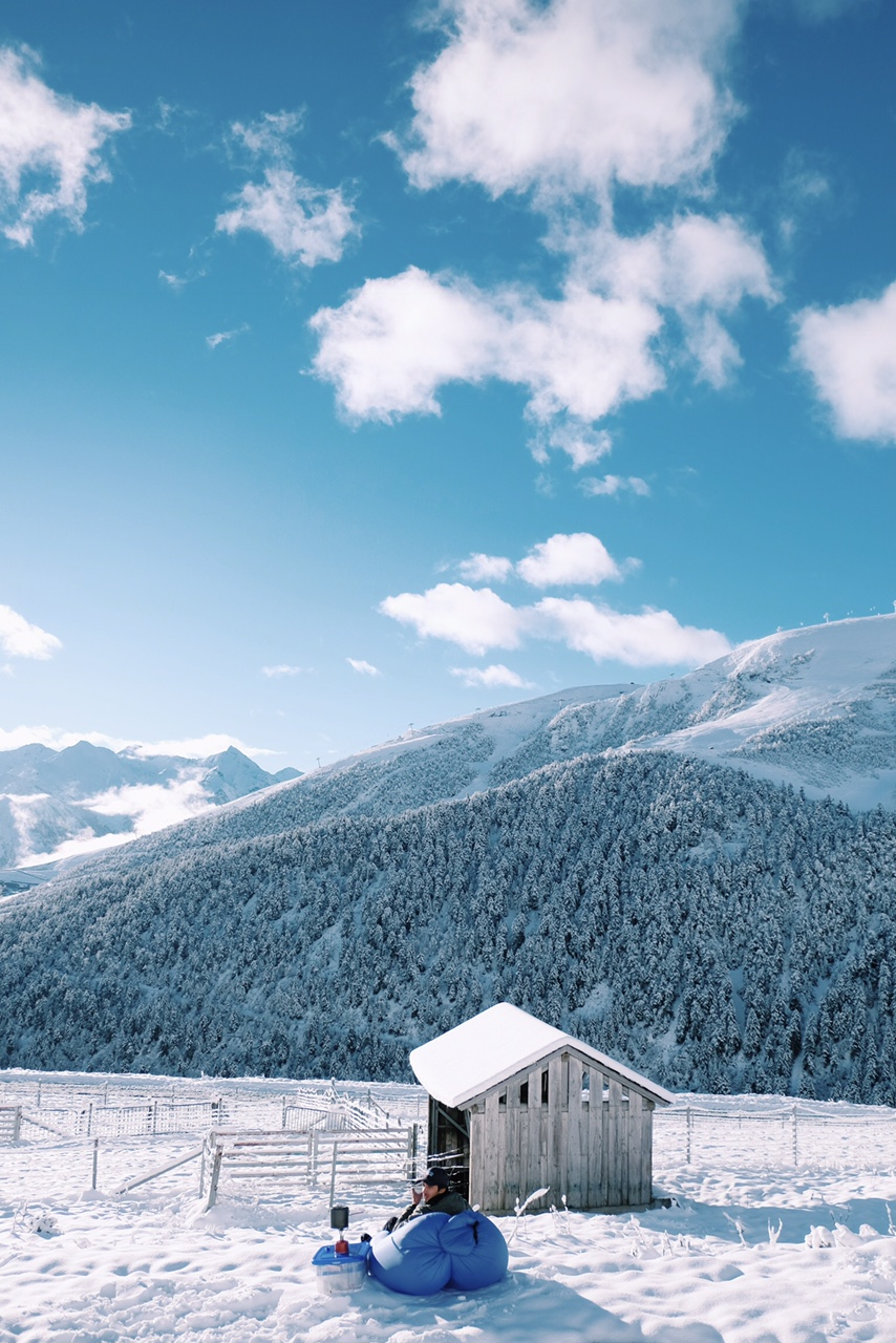 Camille s’amuse en marchant dans la neige à dessiner des coeurs. Après quelques lacets sur cette route sinueuse qui n’en finit plus, on arrive au sommet. Le restaurant Merlans qui accueillera dans quelques semaines les premiers skieurs de la station est blanchi sous une épaisse couche de neige.