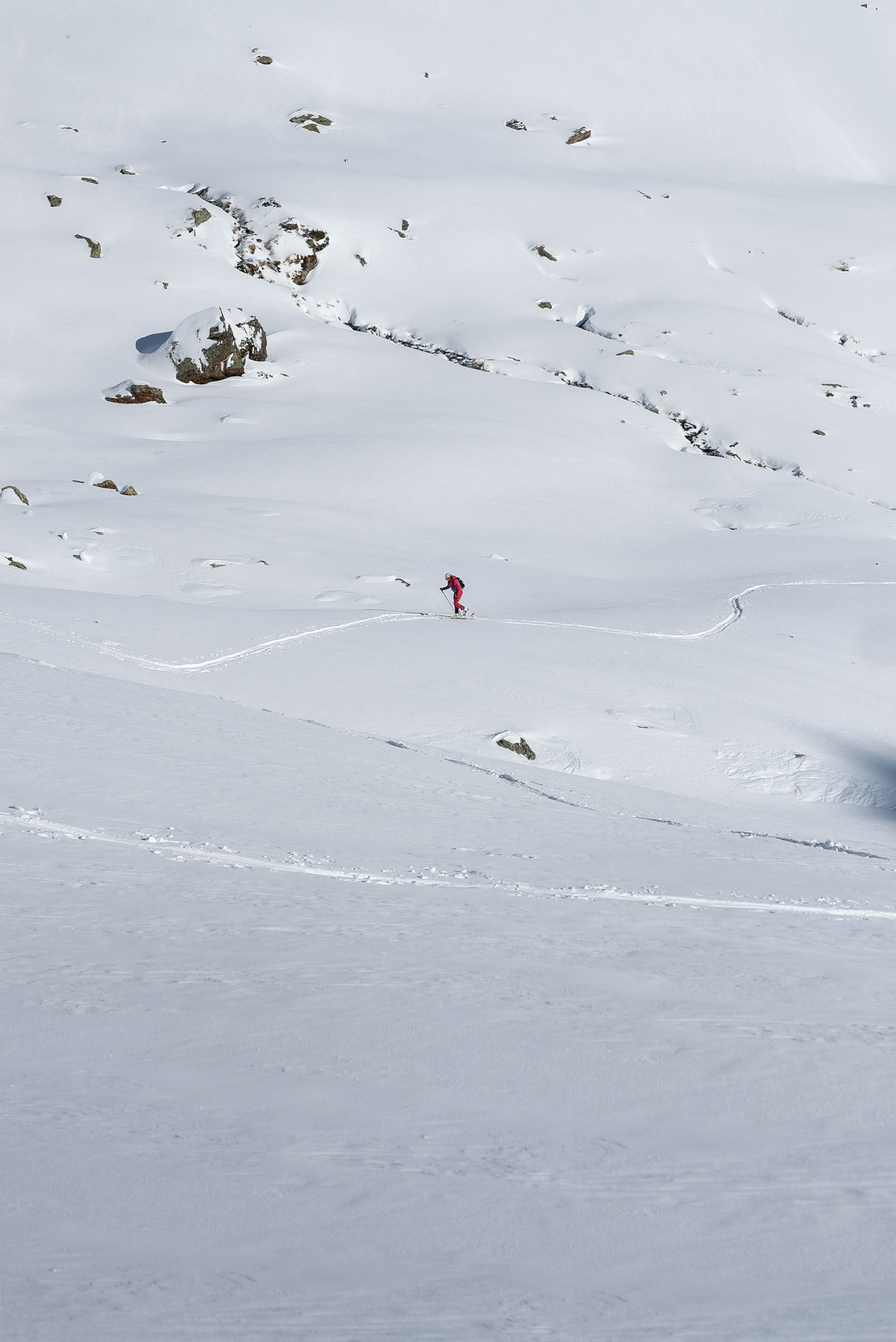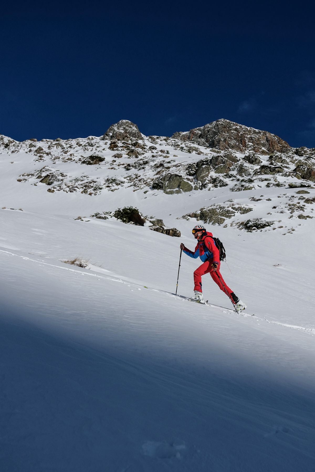 De nouveau mise à niveau sur les conversions. Ce moment où tu prends le virage qui nécessite de tourner tes skis sans t’emmener les pinceaux. Le soleil est au rendez-vous et la neige exceptionnelle. On est vraiment seul dans ce coin isolé des montagnes catalanes.