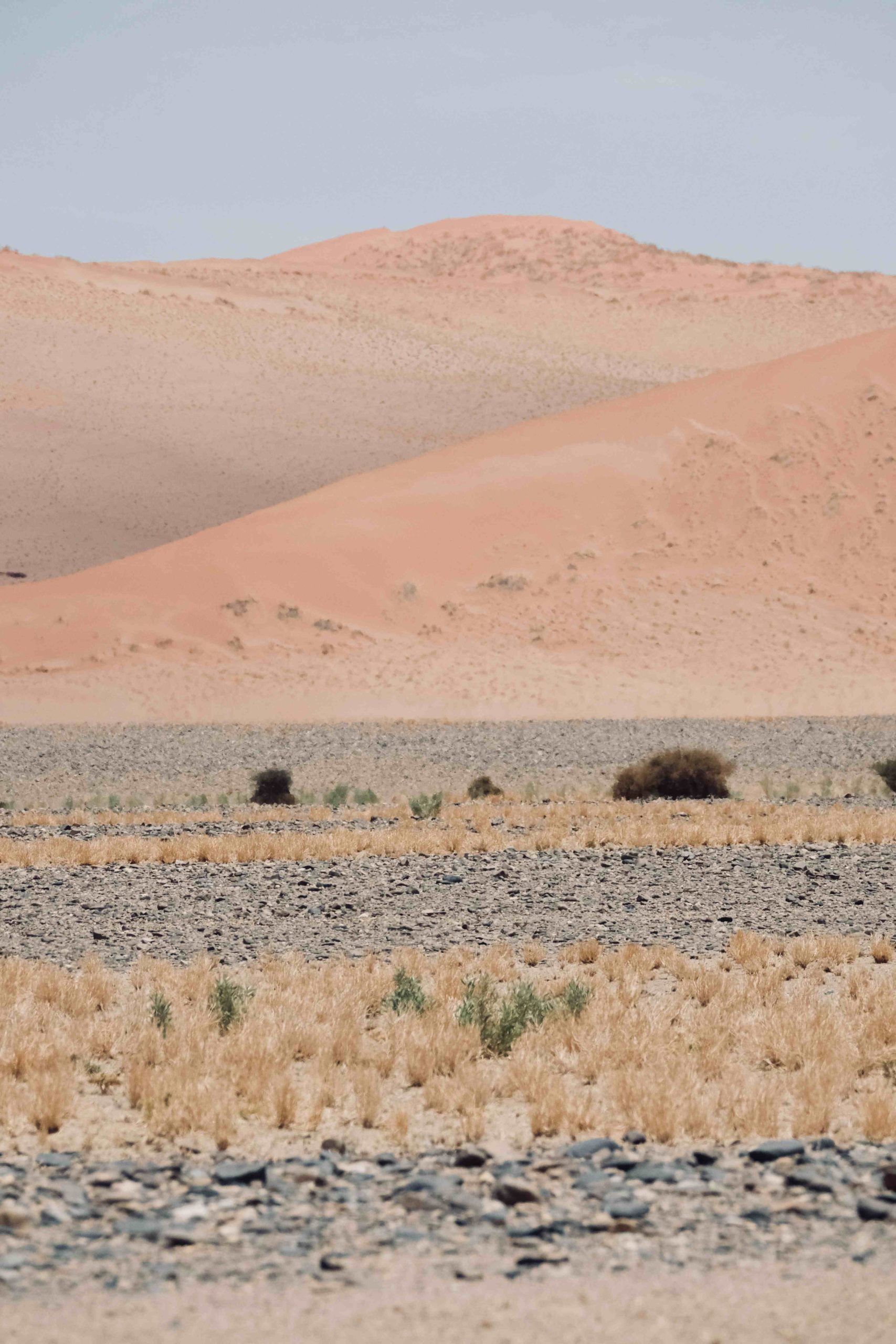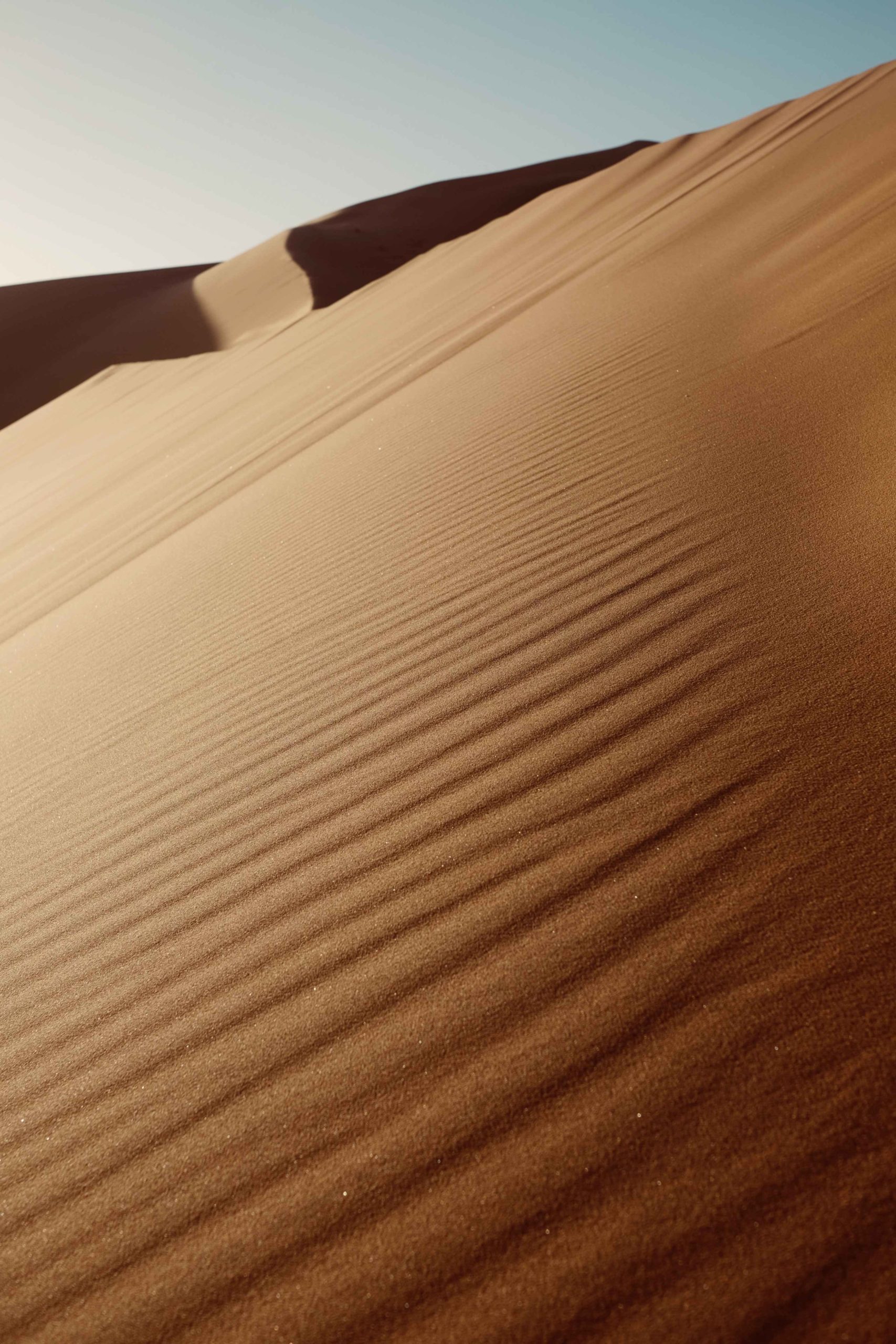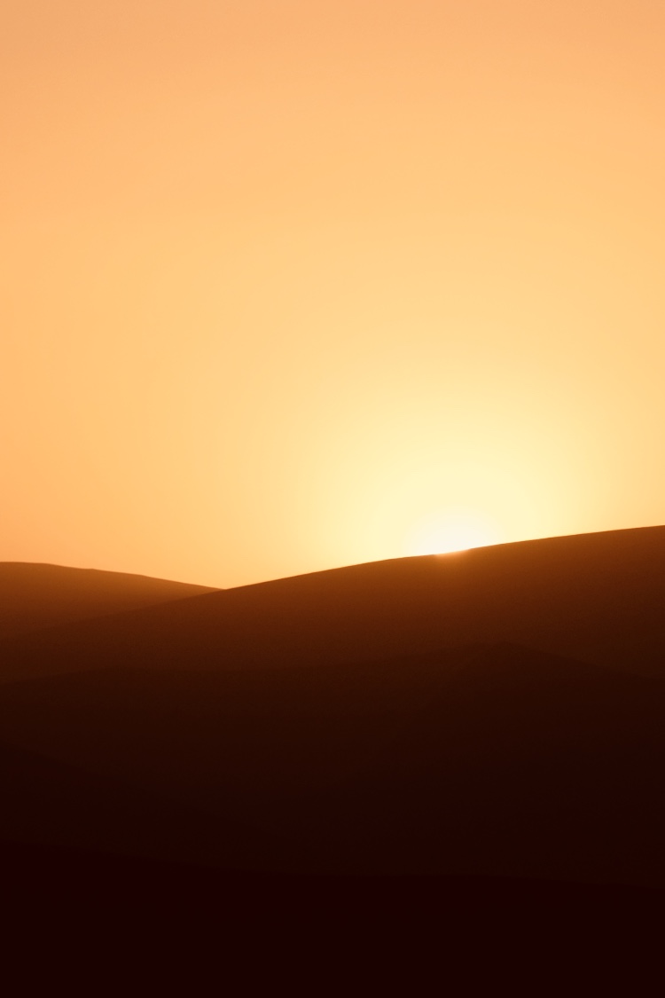 J’avance plus lentement dans le sillage de Camille, deux pas en avant puis un en arrière. L’effort est intense mais je m’accroche à cette vue imprenable. Enfin nous sommes au sommet de la dune. Le soleil s’est levé pour laisser apparaitre ses plus beaux reflets sur le sable. On savoure ce moment. Des dunes à perte de vue à la géométrie parfaite.
