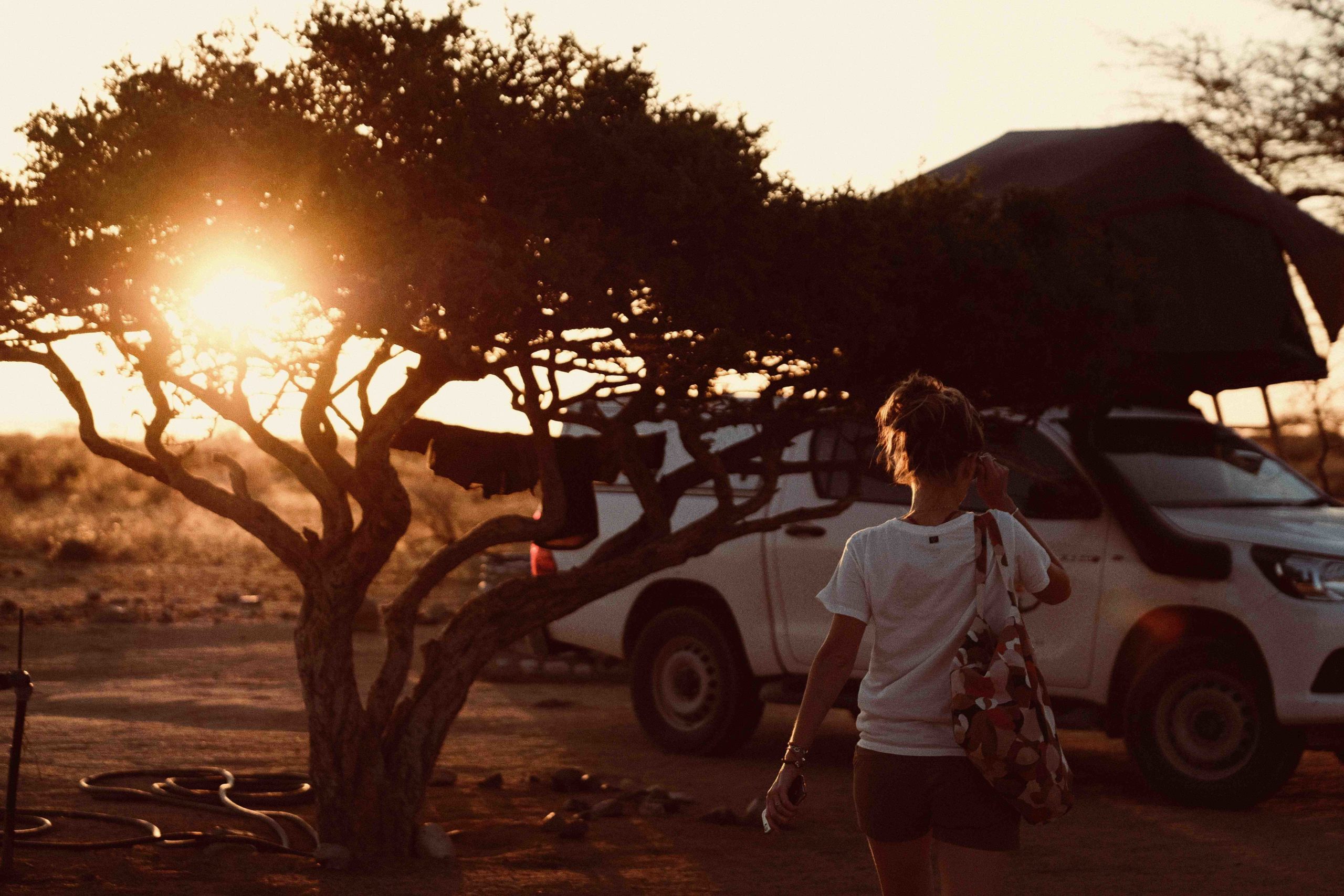 Puis, on arrive enfin à SOLITAIRE. Une longue journée sur la route rythmée par l’arrivée du coucher de soleil. Cette nouvelle soirée namibienne se déroulera dans notre nouveau campement au Solitaire Guest Farm.