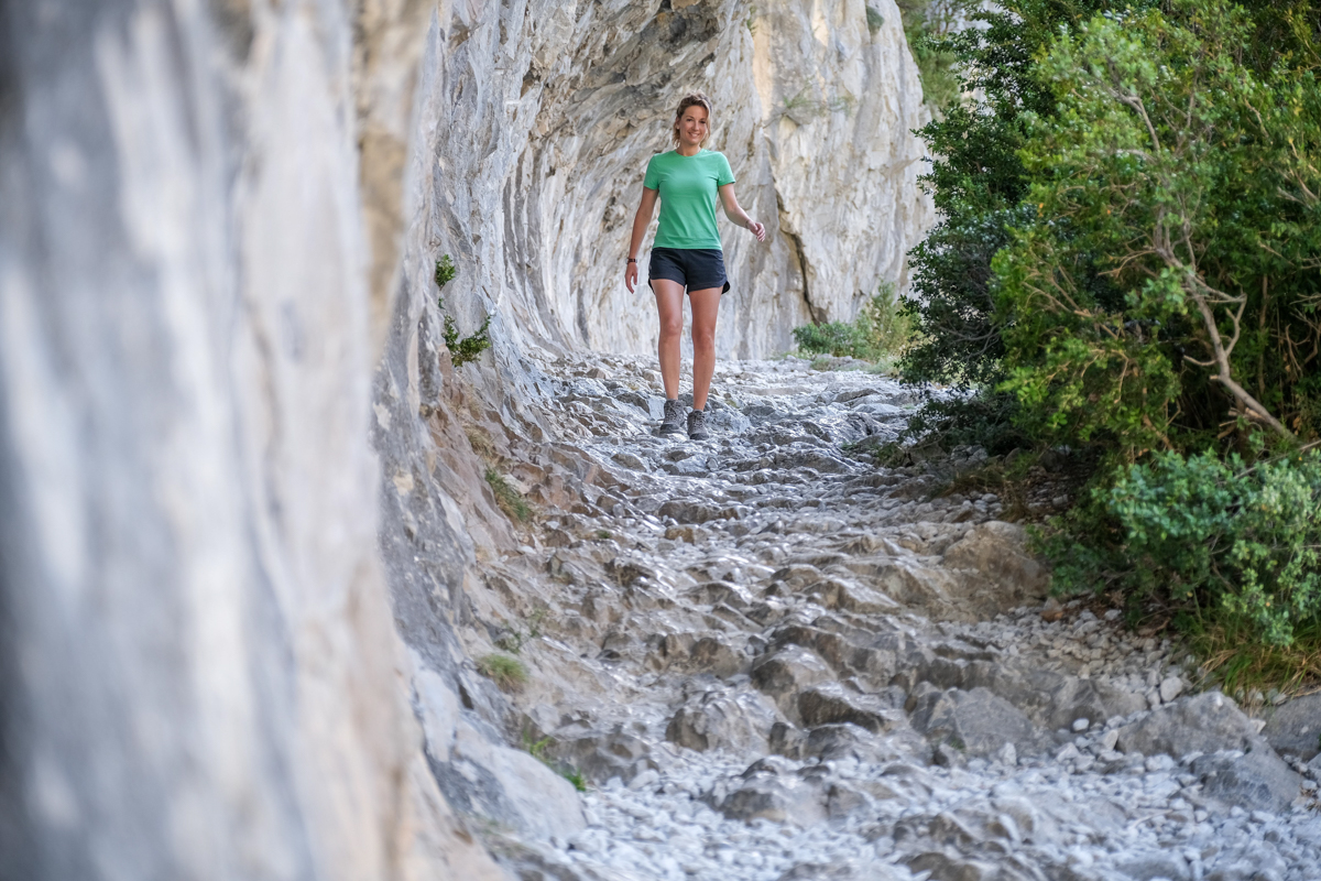 Le début de la randonnée nous plonge directement dans le bain. Un chemin recouvert de pierres avant d’emprunter la partie étroite avec vue plongeante sur le fort du Portalet. Le chemin de la Mâture longe les gorges de l’Enfer, parfois appelées aussi les gorges du Diable, elles sont profondes d’environ 200 mètres.